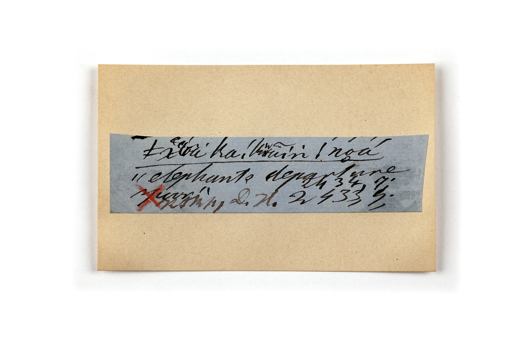 ink on blue paper glued on card