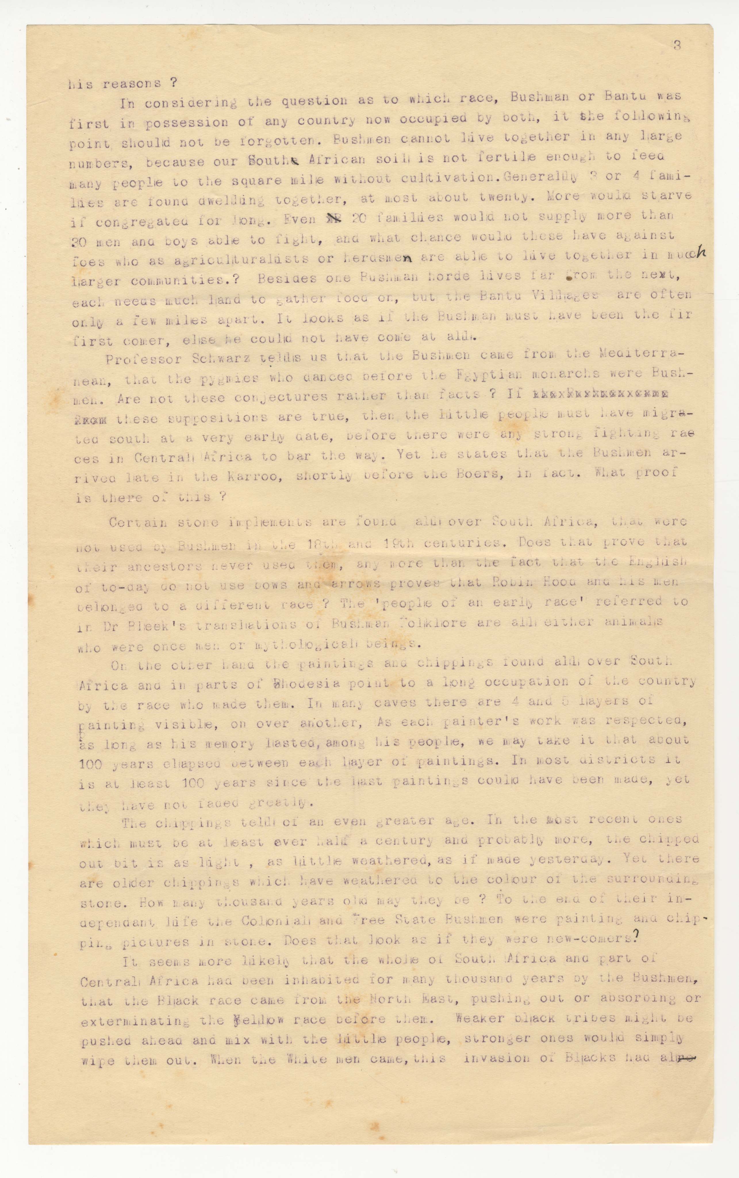 Page 3 of Dorothea Bleek's reprographed 1926 letter to the editor of the Cape Times (Basil Kellett Long), refuting claims in Prof. EHL Schwarz's article in the Saturday edition of the Cape Times titled 'The native nations of South Africa' (1926). Schwarz's article does not refer to George Stow (posthumous) and George McCall Theal's similarly named 'The native races of South Africa' (1905). Instead, Schwarz, a geologist and geographer, comments on recent Bushman-related fieldwork (Dorothea's?) in Angola reported in the Cape Times. UCT's BC 1091 Cape Times Collection confirms that Basil Kellett Long was editor of the Cape Times from 1921 to 1935 (after Maitland Hall Park [1902 to 1921] and before George Hough Wilson [1935 to 1945]). Long is also photographed as 'Editor' in 1926, the year of the paper's golden jubilee (Shaw, 1999: 13, 52). Dorothea writes that she would 'not inflict these Bushmen's [...] names for themselves on the public' ('which are hard to print').