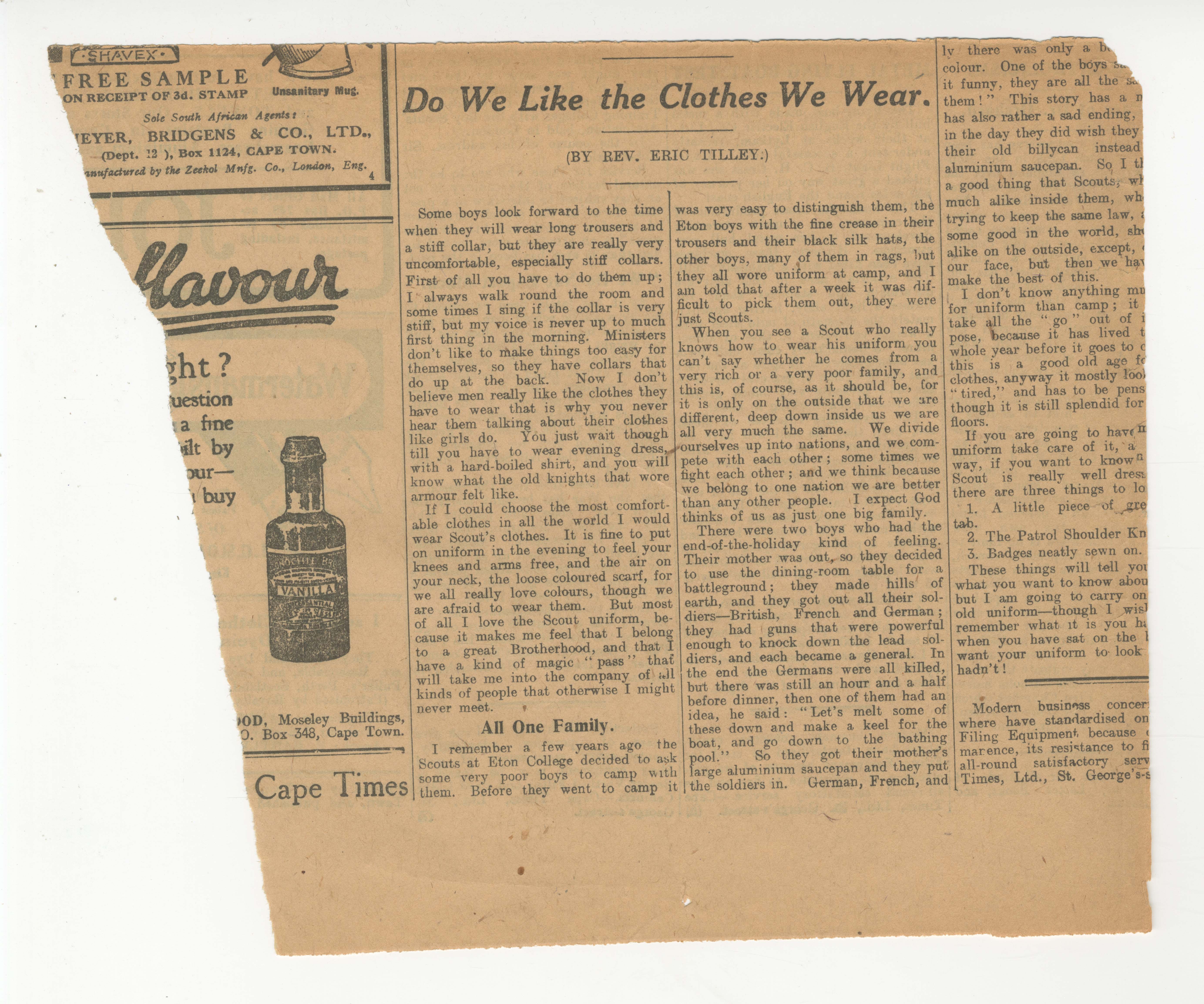 Shavex (an advertisement for), Cape Times, Rev. Eric Tilley (his views on clothing)