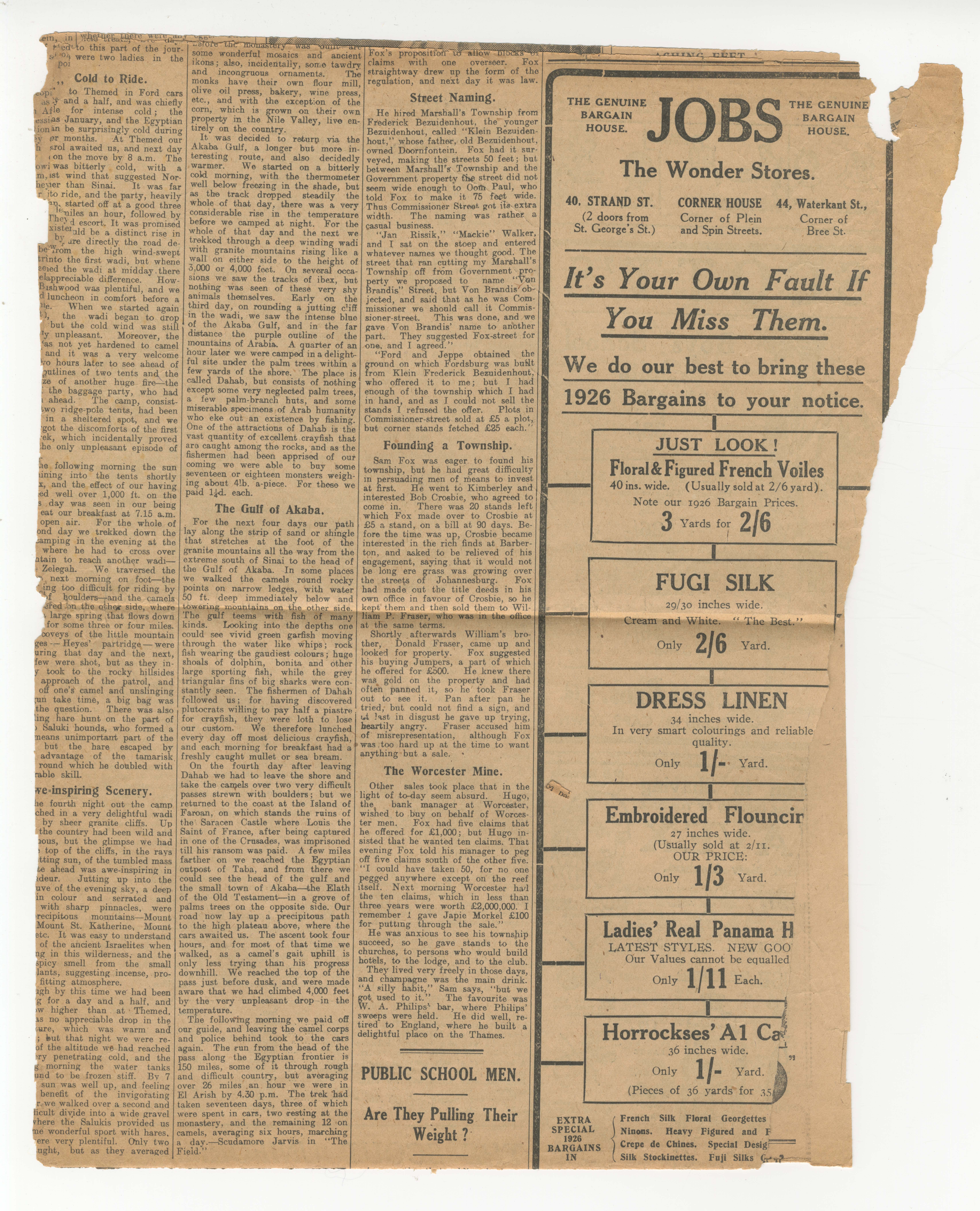 Gulf of Akaba (Gulf of Aqaba), Samuel Fox (Fox Street's namesake), Paul Kruger (Oom Paul), Klein Frederick Bezuidenhout, Jan Rissik, Mackie Walker, Marshall's Township, Commissioner Von Brandis (naming a street after him), township (founding a), Bob Crosbie, William P Fraser, Donald Fraser, gold, Worcester mine (Japie Morkel), Japie Morkel, Jobs (an advertisement for)
