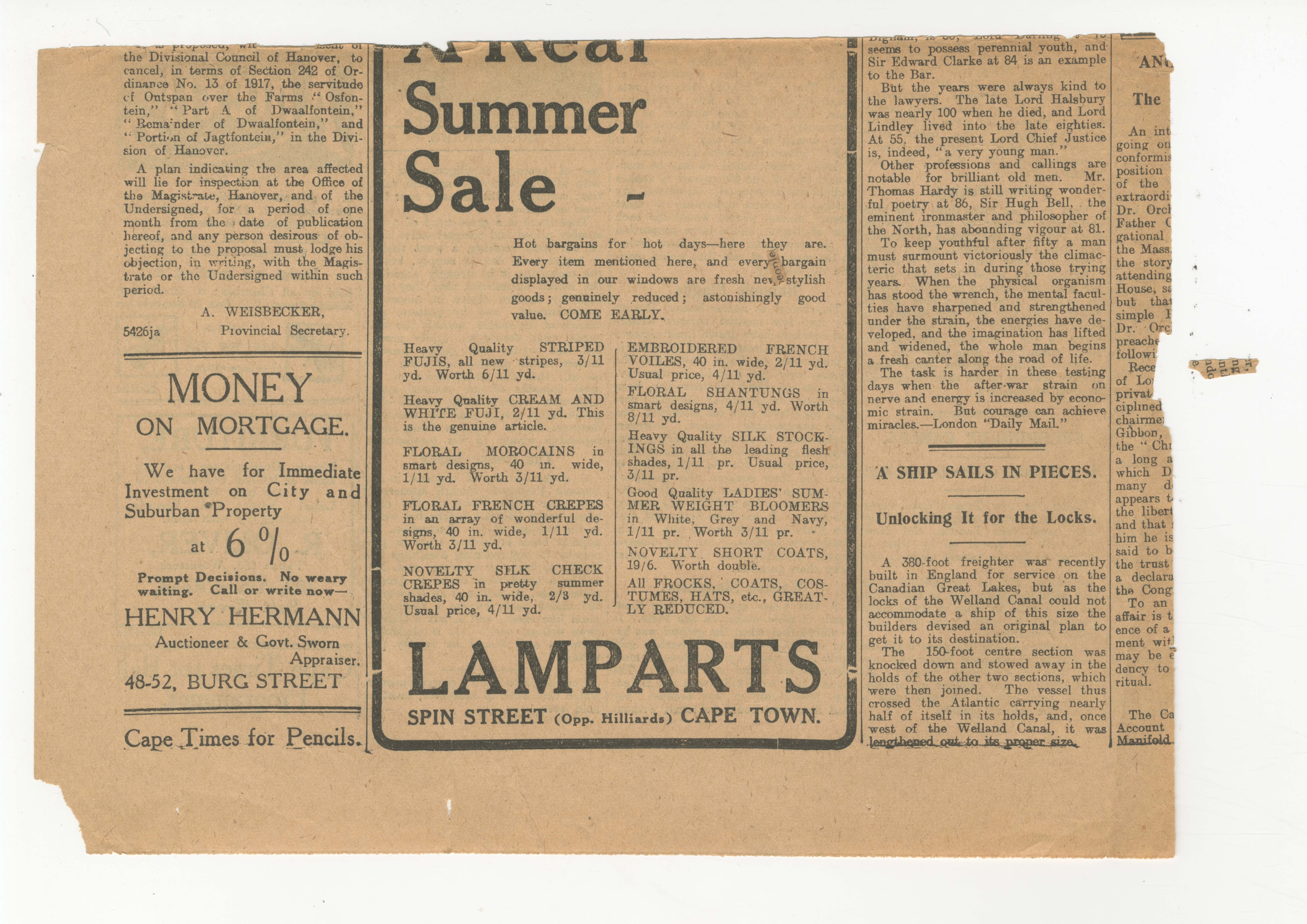 Osfontein (a Hanover farm), Dwaalfontein (a Hanover farm), Jagtfontein (a Hanover farm), Hanover (Divisional Council of), Henry Hermann (an advertisement for), Lamparts (an advertisement for)