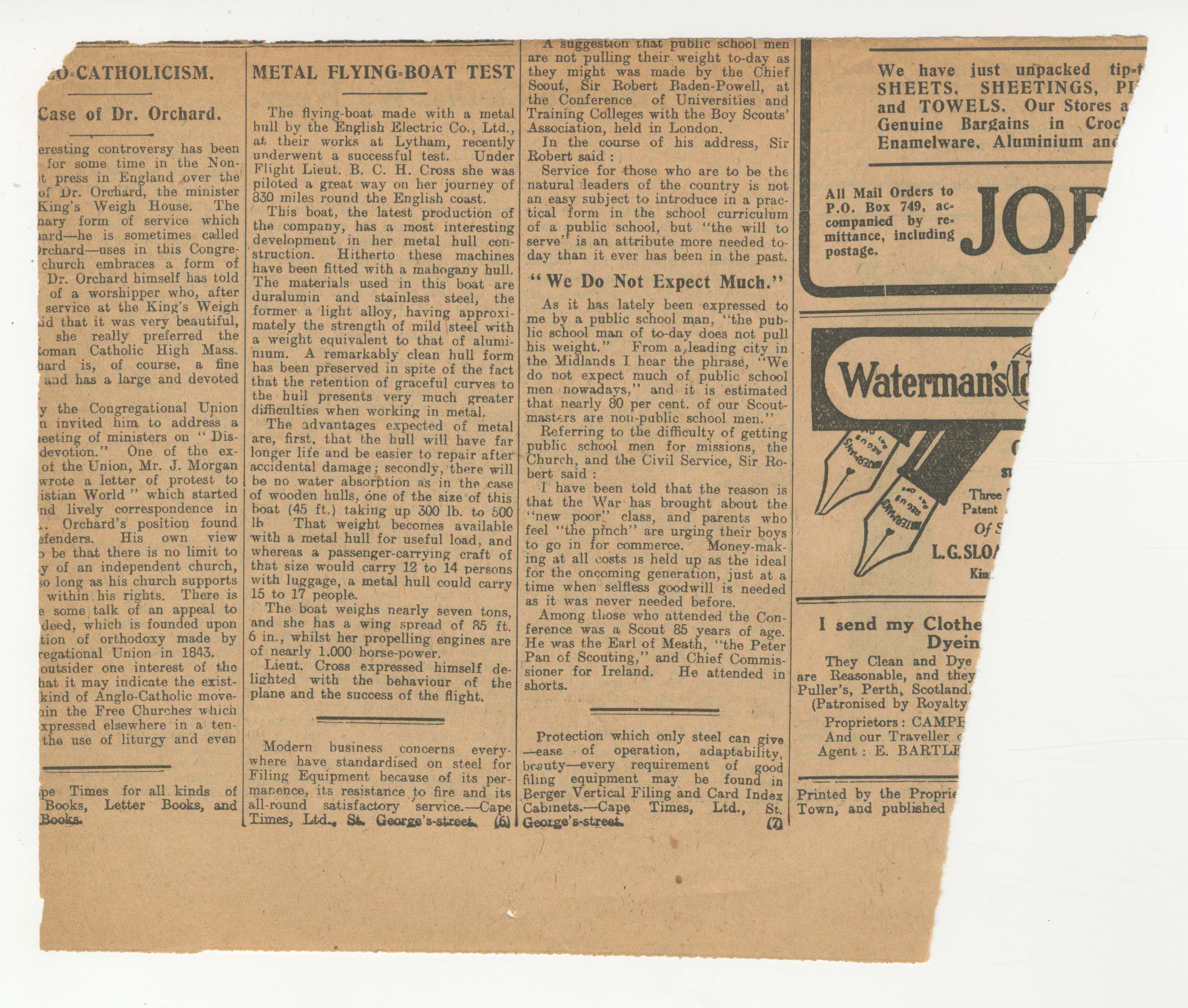 William Edwin Orchard (Dr Orchard), Catholicism (Roman Catholic High Mass), Lieutenant BCH Cross, flying boat (piloted by Lieutenant BCH Cross), Sir Robert Baden-Powell, Jobs (an advertisement for), Waterman's Ideal Fountain Pen (LG Sloan Limited)