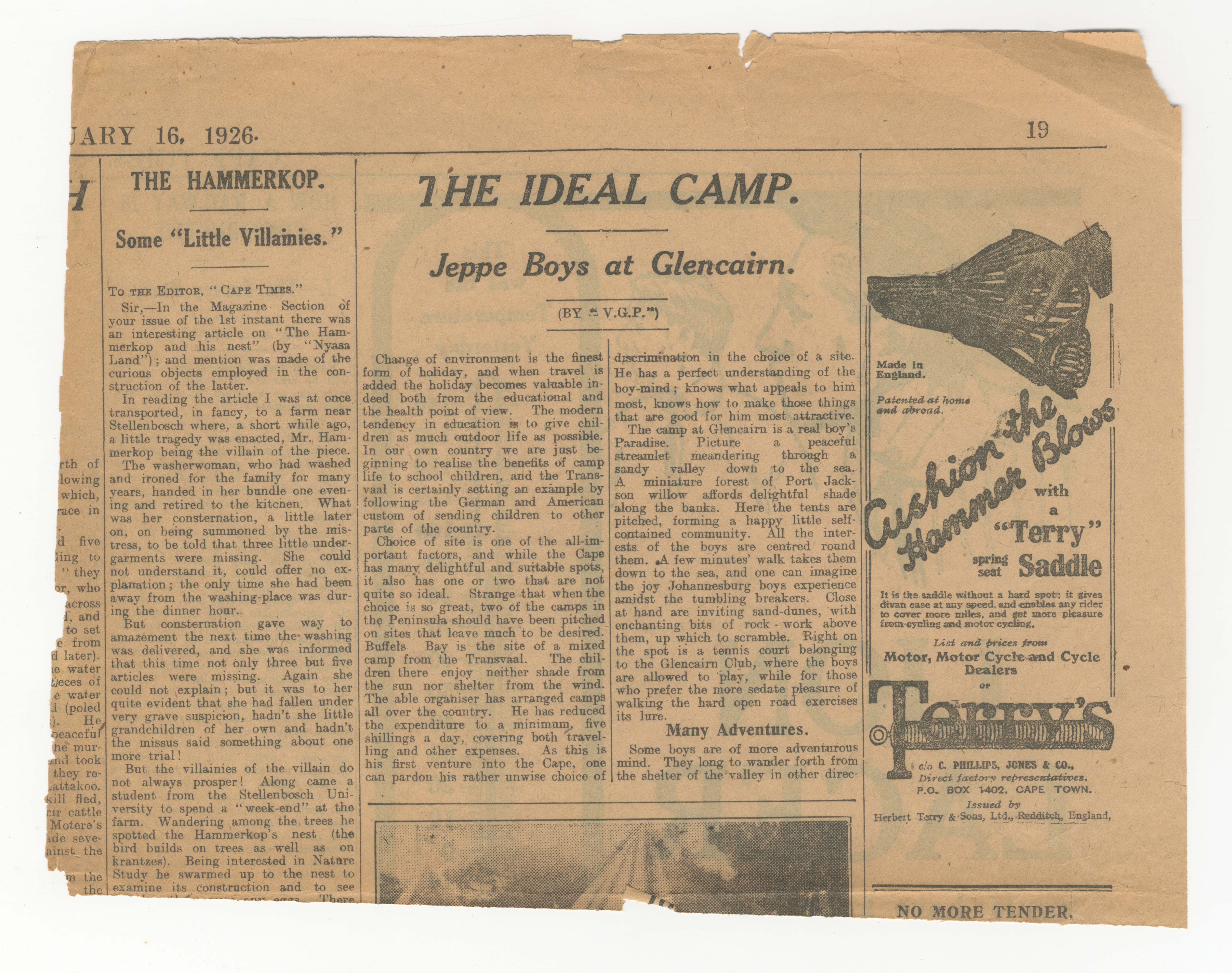 Hammerkop (a medium-sized waterbird), Cape Times (a letter to its editor), nests (made from curious objects), Jeppe Boys High School, Glencairn (on the False Bay Coast), Glencairn Club, Terry's (an advertisement for)