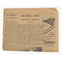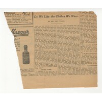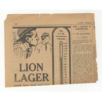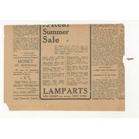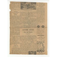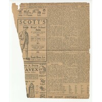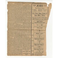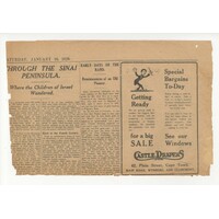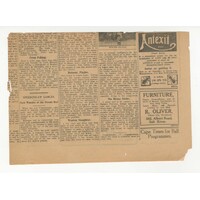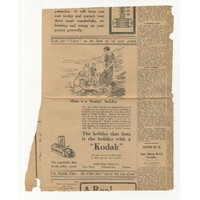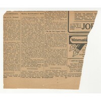 Reconstituted newspaper clippings with monochrome columnated text and illustrations, with a loss of relevant text from non-perpendicular cuts/tears and edge frailty.
