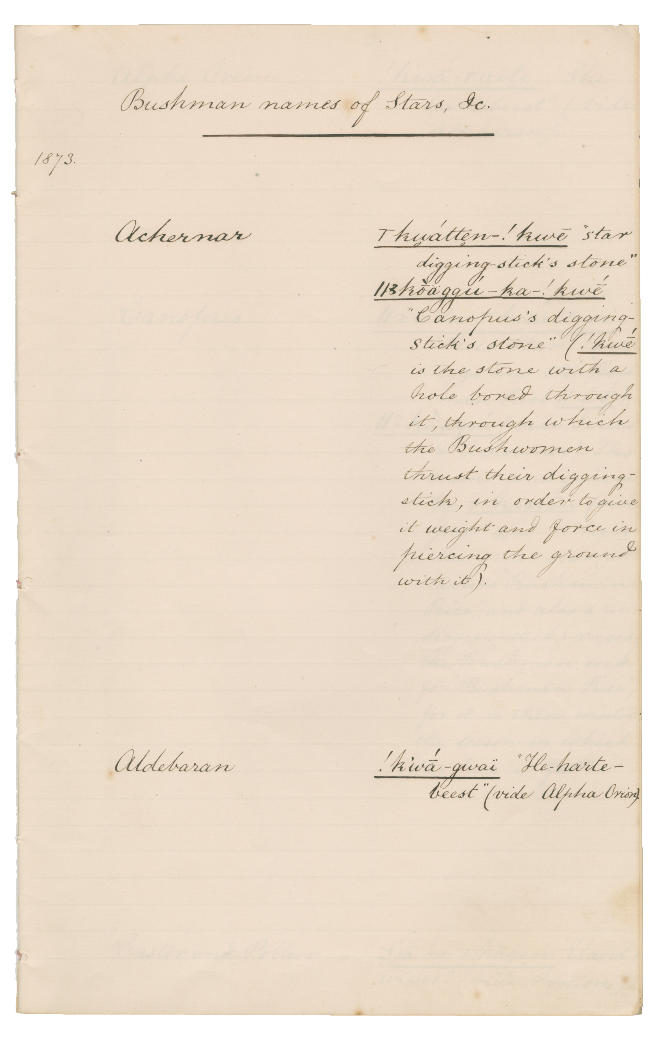 star, Achernar (digging stick's stone), Canopus (digging stick's stone), Aldebaran (hartebeest), Alpha Orion
