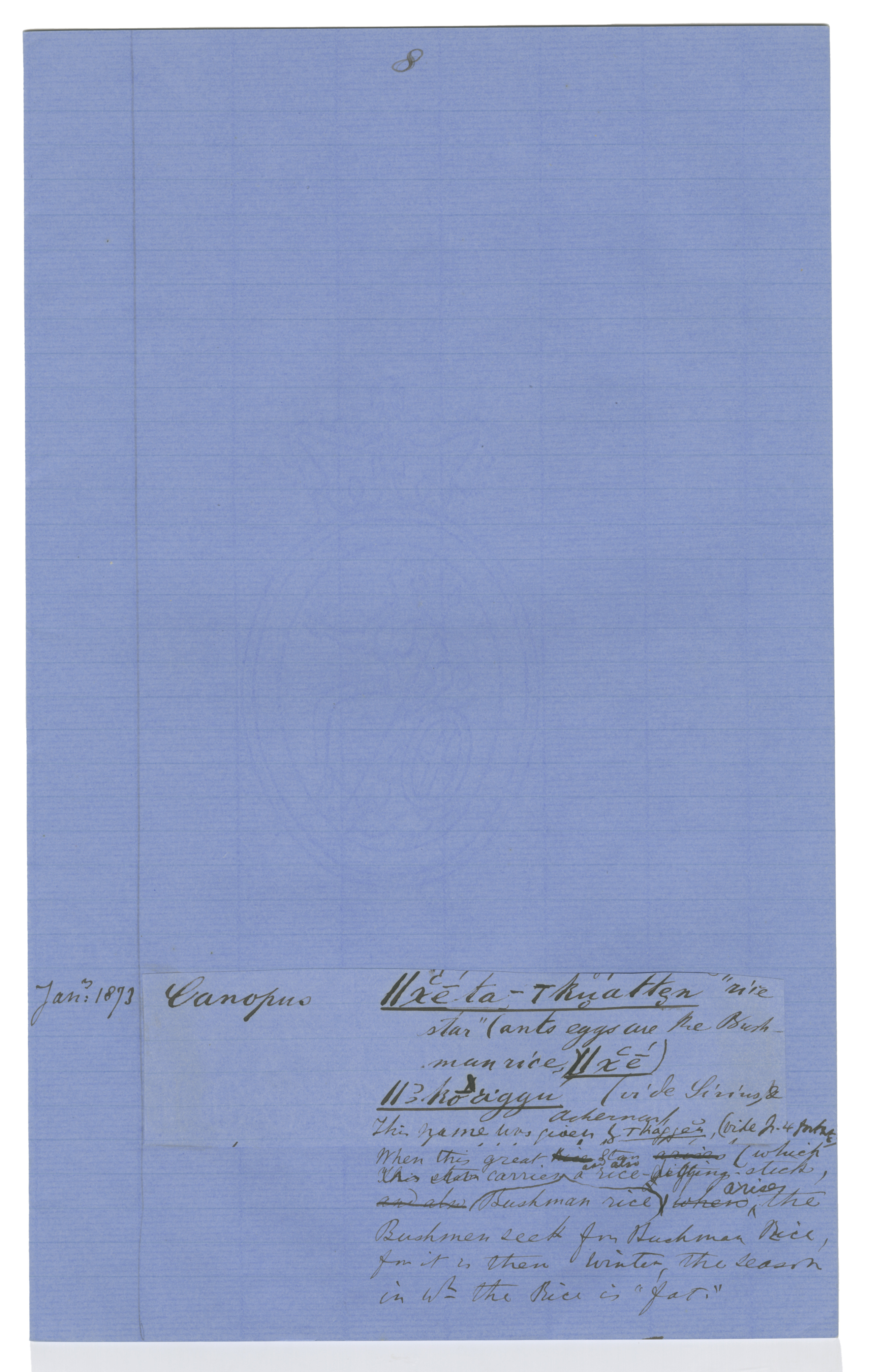 Handwritten unpublished notes by Wilhelm Bleek. MS. On blue foolscap folio (watermarked with seated Britannia). The lighter, better-formed script is likely LC Lloyd's.