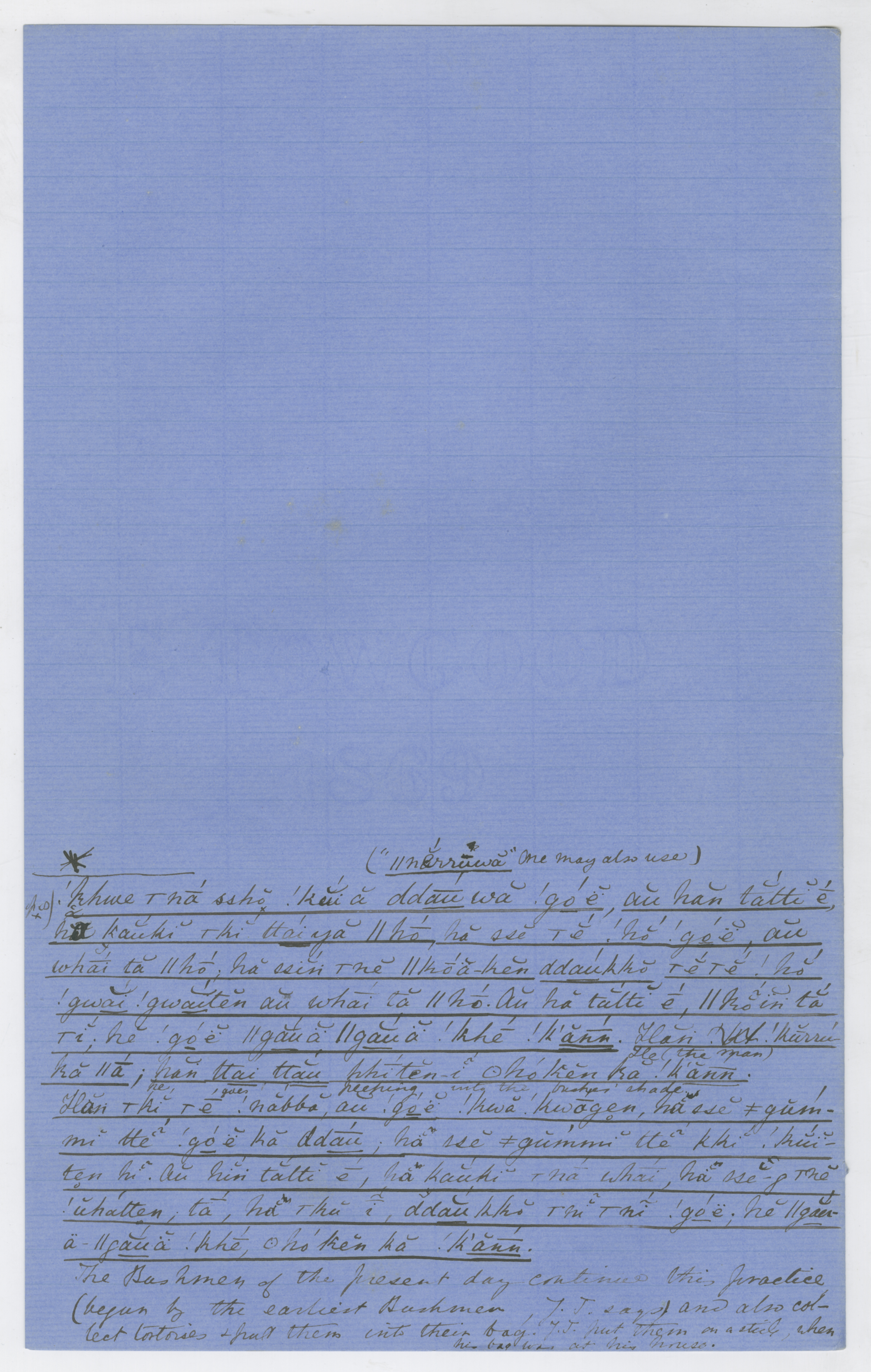 Handwritten unpublished notes by Wilhelm Bleek. MS. On blue foolscap folio (watermarked with seated Britannia). The lighter, better-formed script is likely LC Lloyd's.