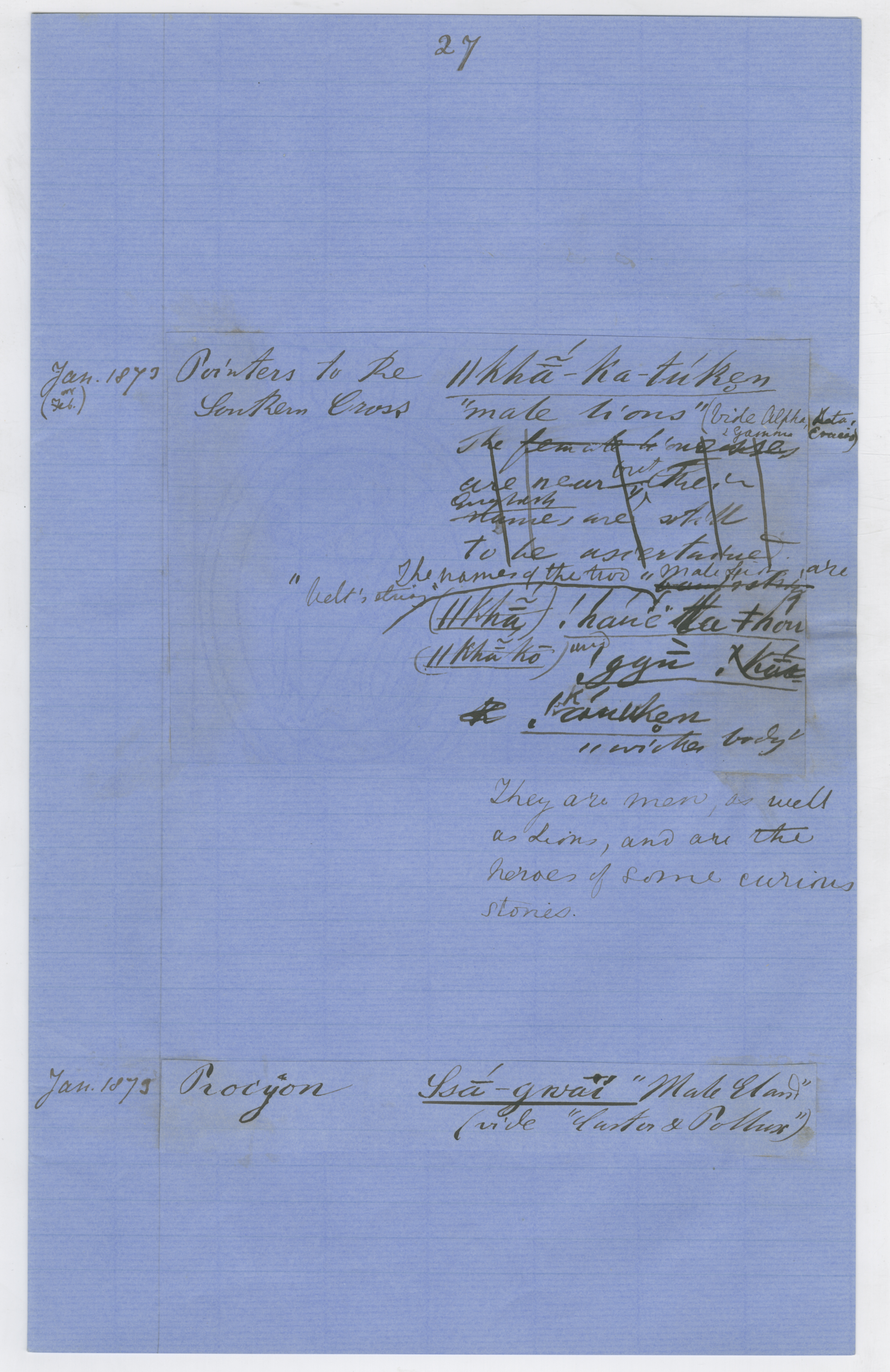 Handwritten unpublished notes by Wilhelm Bleek. MS. On blue foolscap folio (watermarked with seated Britannia). The lighter, better-formed script is likely LC Lloyd's.