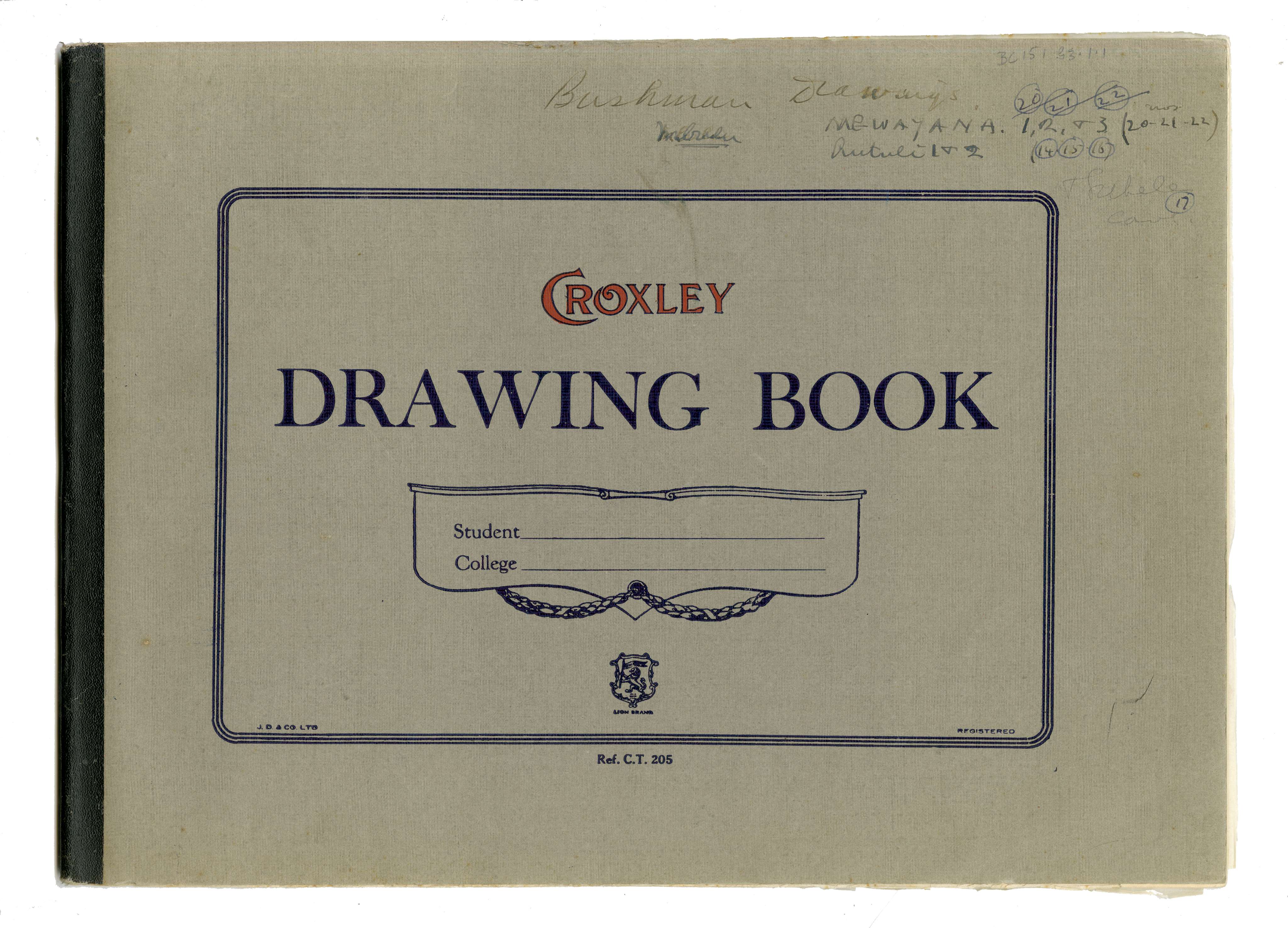 Bushman drawings, Mgwayana, Rutuli, rock art (tracings of), Croxley drawing book (sketchbook), sketchbook (with notes on colour)
