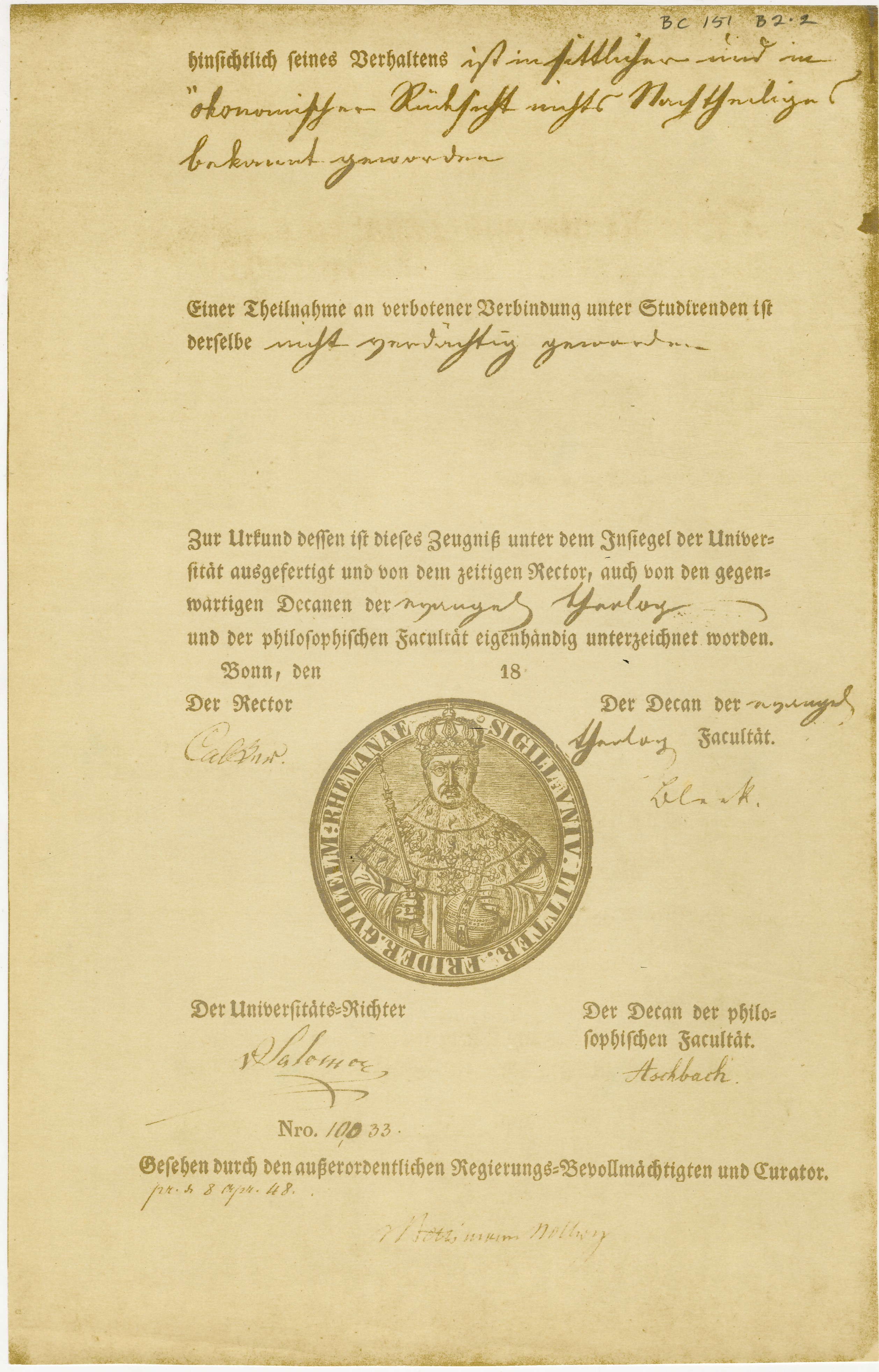 certificates and other records (concerning WHI Bleek's studies, 1845/1846), WHI Bleek's studies at the Königlich Preußische Rheinische Friedrich-Wilhelms-Universität at Bonn (i.e., Bonn University), Germany