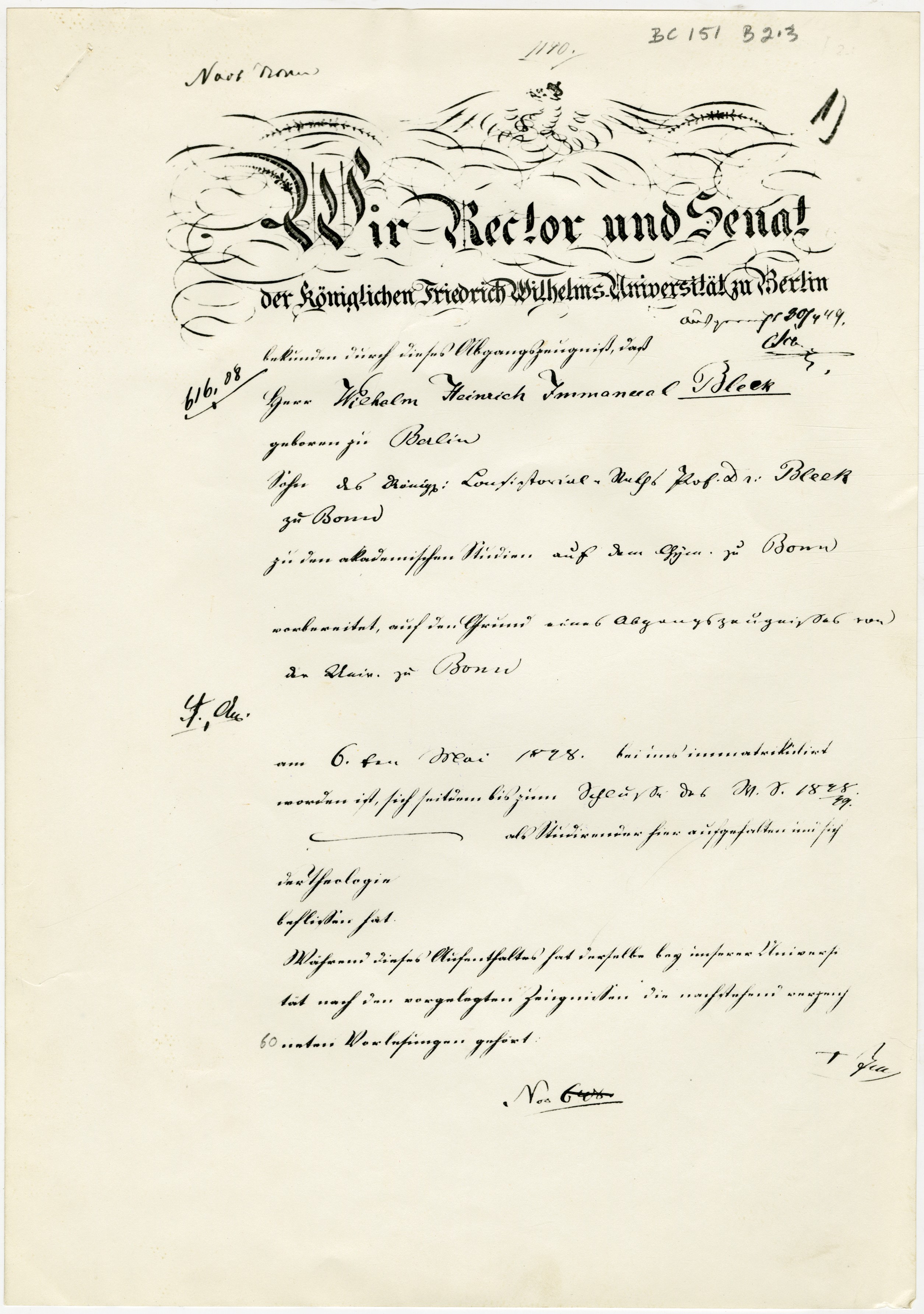 certificates and other records (concerning WHI Bleek's studies, 1845/1846), WHI Bleek's studies at the Königlich Preußische Rheinische Friedrich-Wilhelms-Universität at Bonn (i.e., Bonn University), Germany