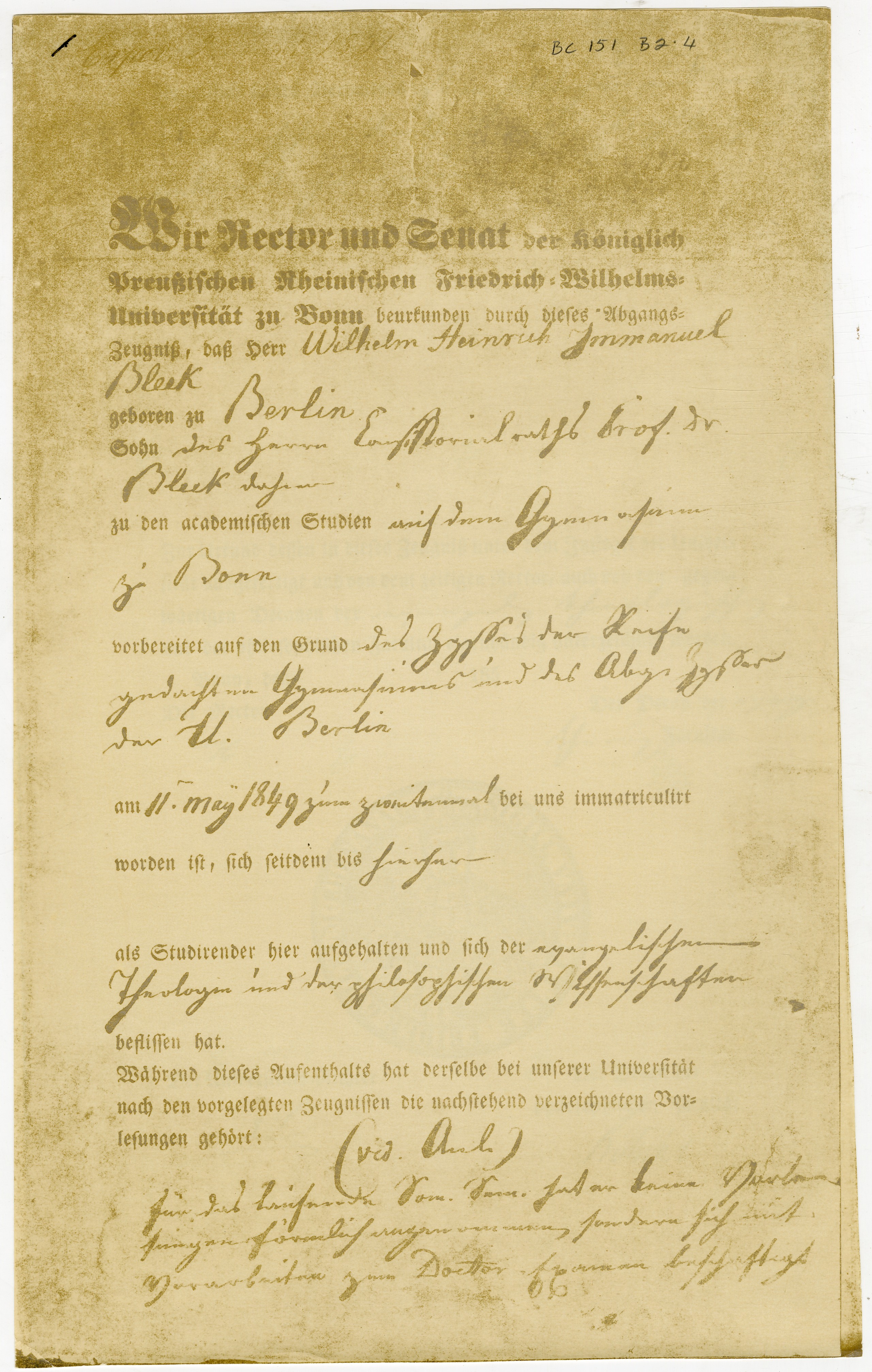 For eight years, Wilhelm Bleek (1827-1875) attended a gymnasium in Bonn. Bleek undertook tertiary studies from 1845 to 1851, enrolling with Bonn's theology faculty for his first course in the winter semester of 1845/6 (Bank, 2006: 15-16). He moved across to 'Berlin University' (i.e., the Friedrich Wilhelm University of Berlin) in his third year of undergraduate study, returning to Bonn in the summer semester of 1849 and concluding his 'final semester of formal study' there in the winter of 1850/1 (Bank, 2006: 18). Bleek graduated with a PhD in Linguistics from Bonn in 1851.