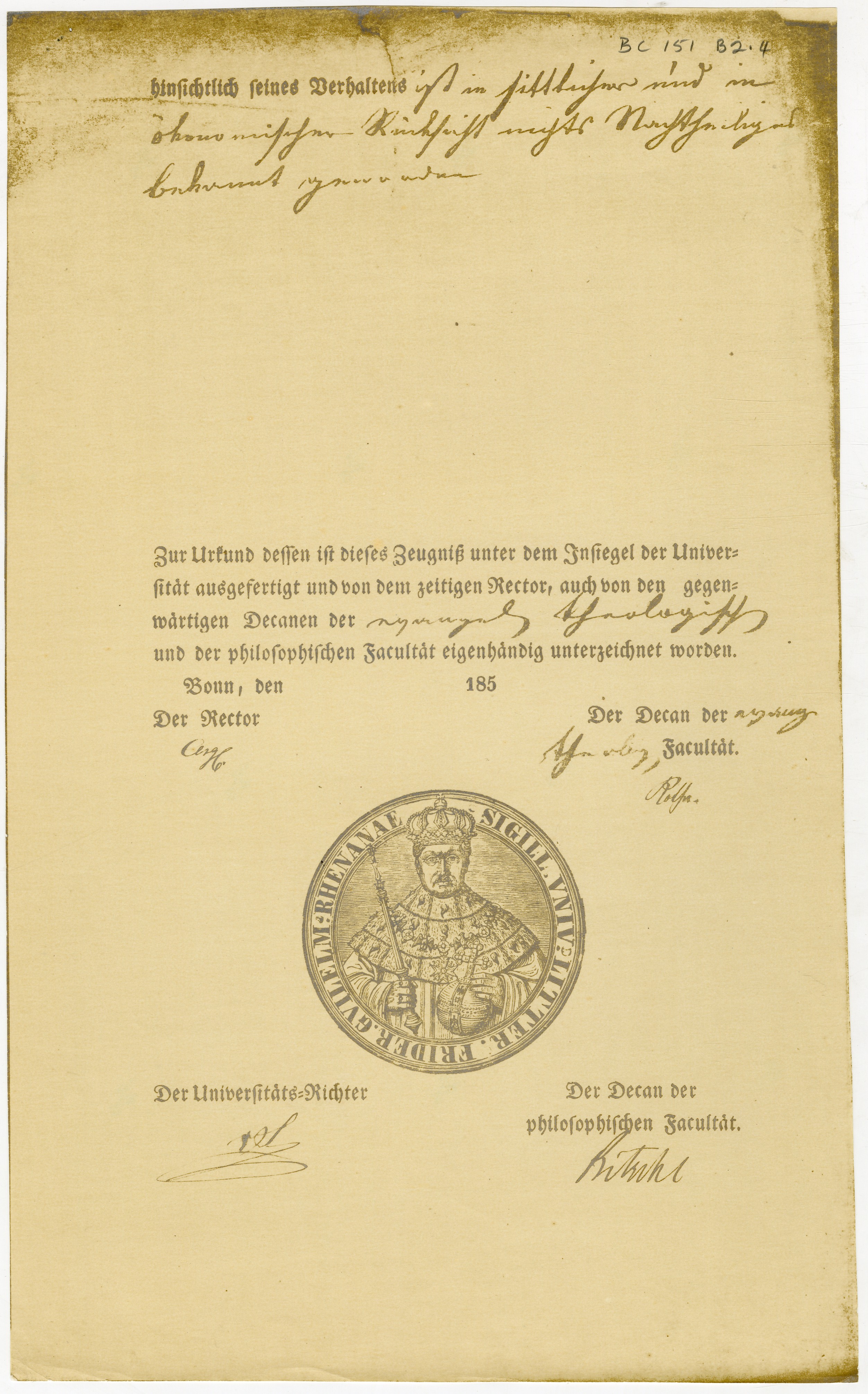 certificates and other records (concerning WHI Bleek's studies, 1845/1846), WHI Bleek's studies at the Königlich Preußische Rheinische Friedrich-Wilhelms-Universität at Bonn (i.e., Bonn University), Germany