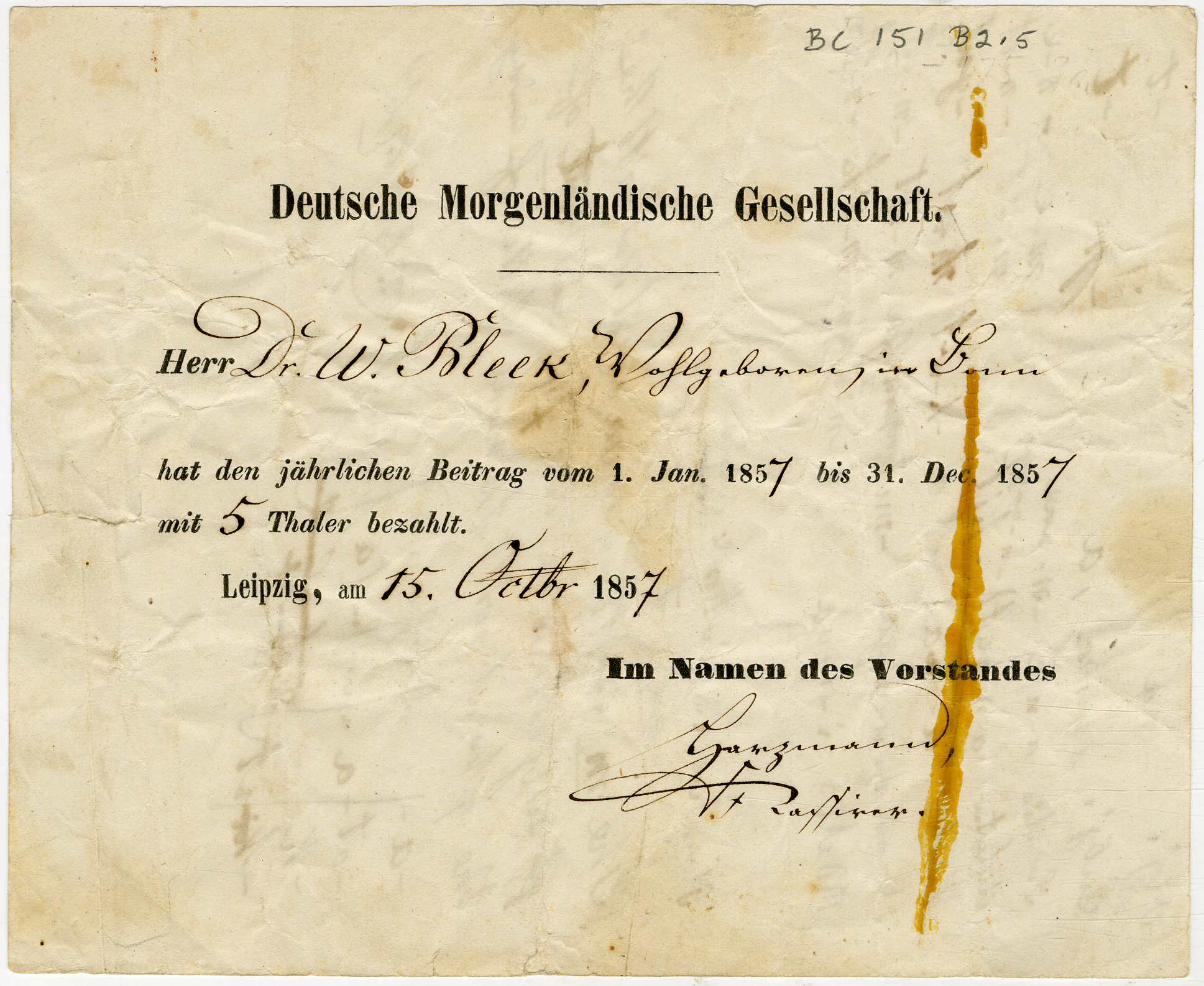 certificates and other records (concerning WHI Bleek), German Oriental Society, annual contribution ('Jährlichen Beitrag')