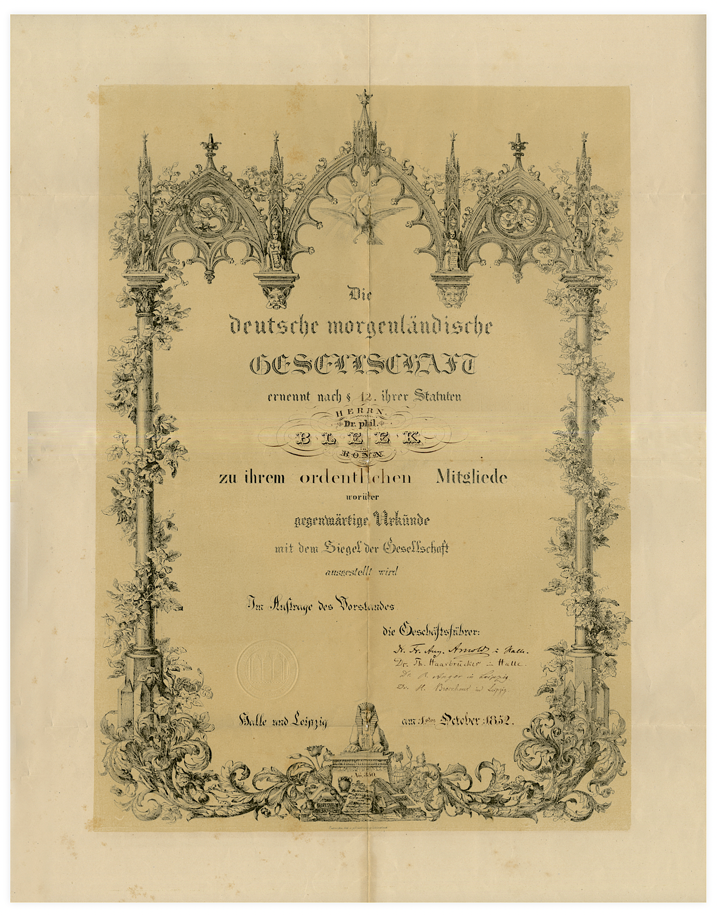 WHI Bleek's membership diploma for the German Oriental Society (Deutsche Morgenländische Gesellschaft). Original