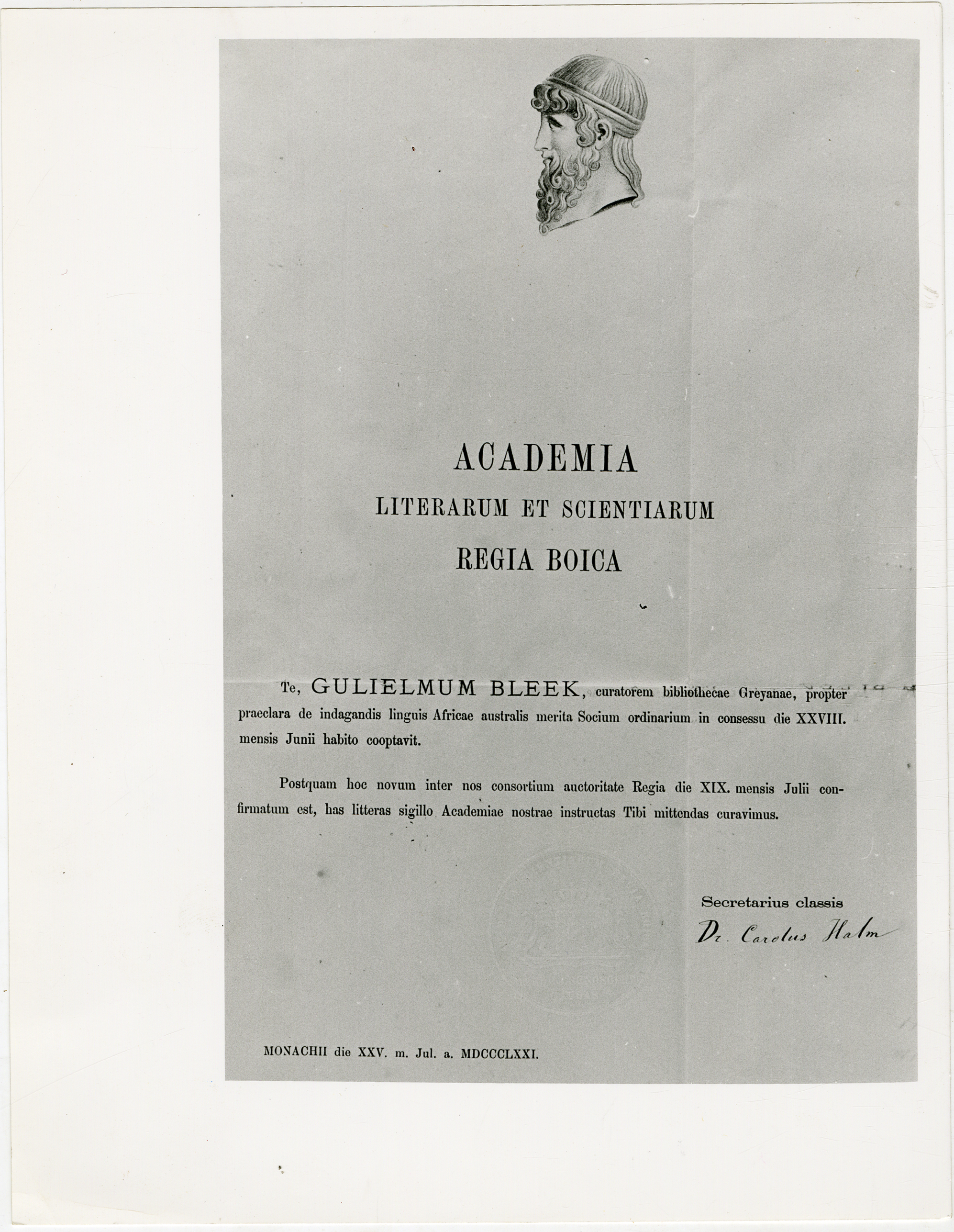 A scan of a grayscale copy. The Deetz Catalogue (i.e., the 'Family Collection') transcription reads 'Academia Literarum et Scientiarum Regia Boica. 1871', it reads 'Te, GULIELMUM BLEEK, curarorem bibliothecae Greyanae, propter praaeclara de indagandis linguis Africa australis merita Socium ordinaarium in consessu die XXVIII. Mensis Junii habito cooptavit. Postquam hoc novum inter nos consortium auctoritate Regia die XIX, mensis Julii confirmatrum est, has litteras sigillo Academiae nostrae instructas Tibi mittendas curavimus. Secretarius classis Dr. Carolus Halm [original signature] Monachii die XXV. M. Jul. a MDCCCLXXI.' Dimensions: 18 x 12" [folded double sheet, 36 x 24"]. Certificate bears impressed seal with coat of arms in center, "Academia Scientiarum Regia Boica Rerum Cognoscere Causas".