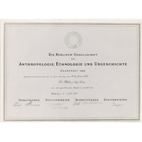 certificates and other records (concerning WHI Bleek), Berlin Society for Anthropology, Ethnology, and Prehistory, membership diploma, Wilhelm Bleek's