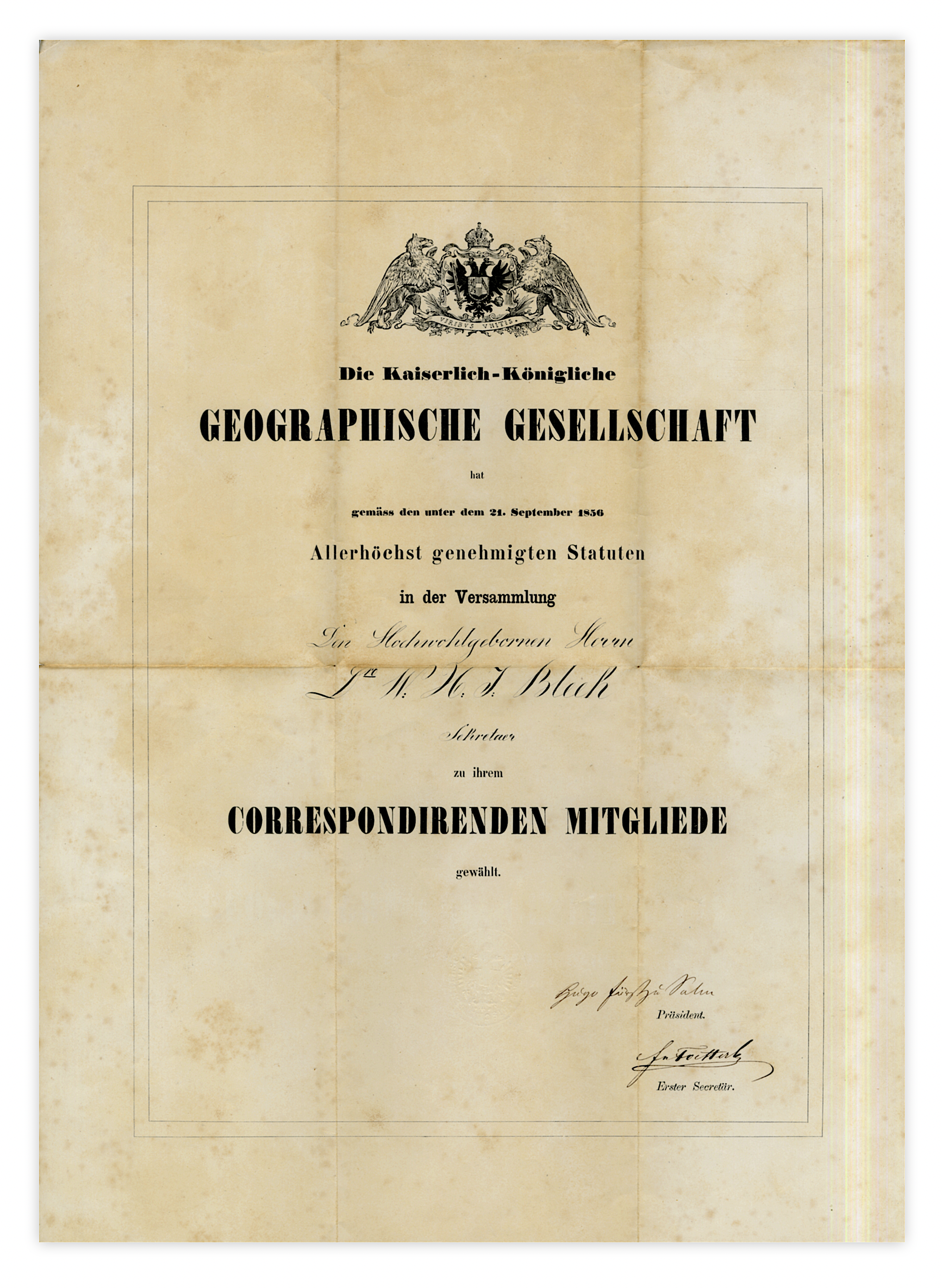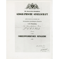 WHI Bleek's membership diploma from the Imperial-Royal Geographical Society (Kaiserlich-Königliche Geographische Gesellschaft). Original