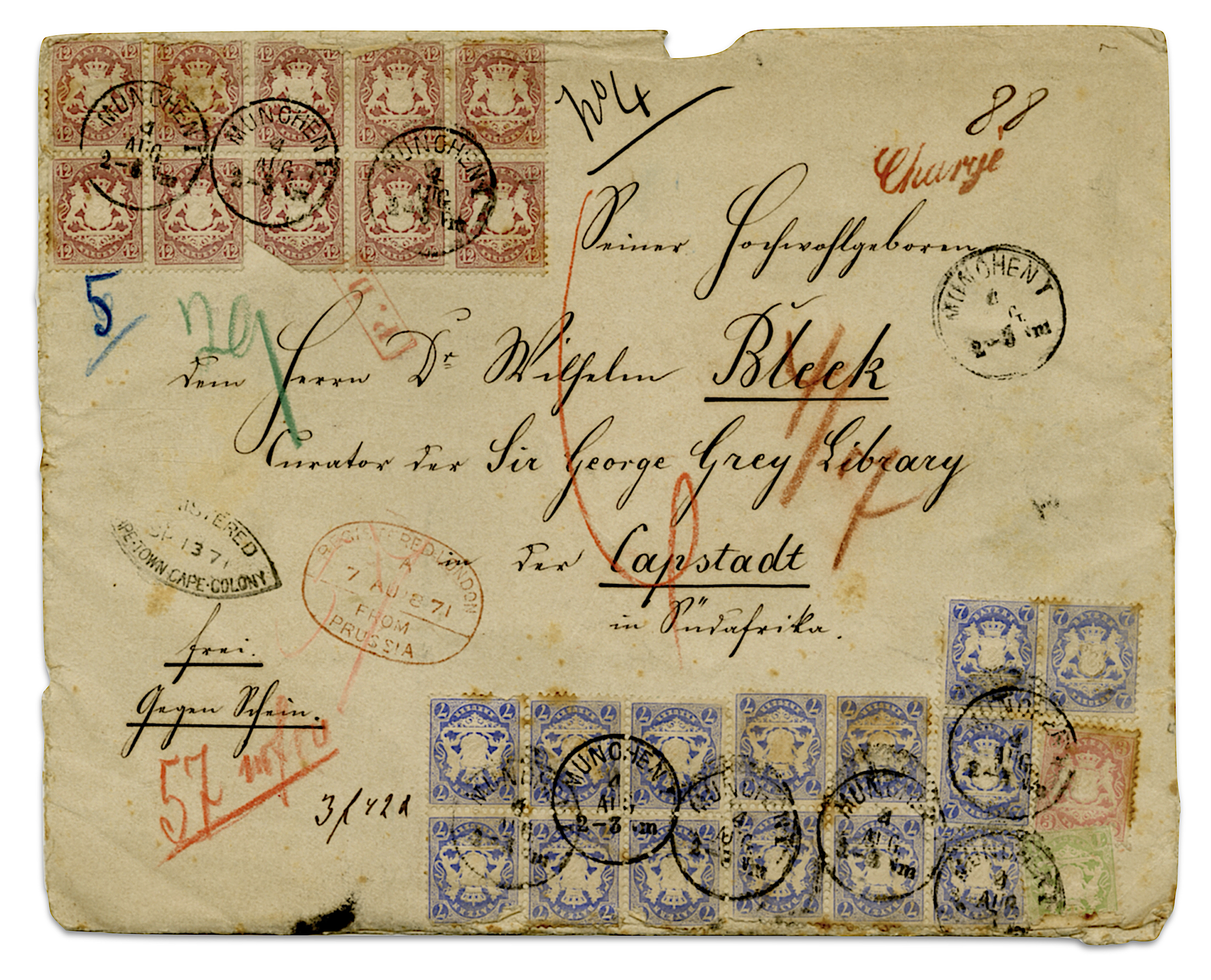 Envelope addressed to Wilhelm Bleek, Curator for the Sir George Grey Library (obverse). Original