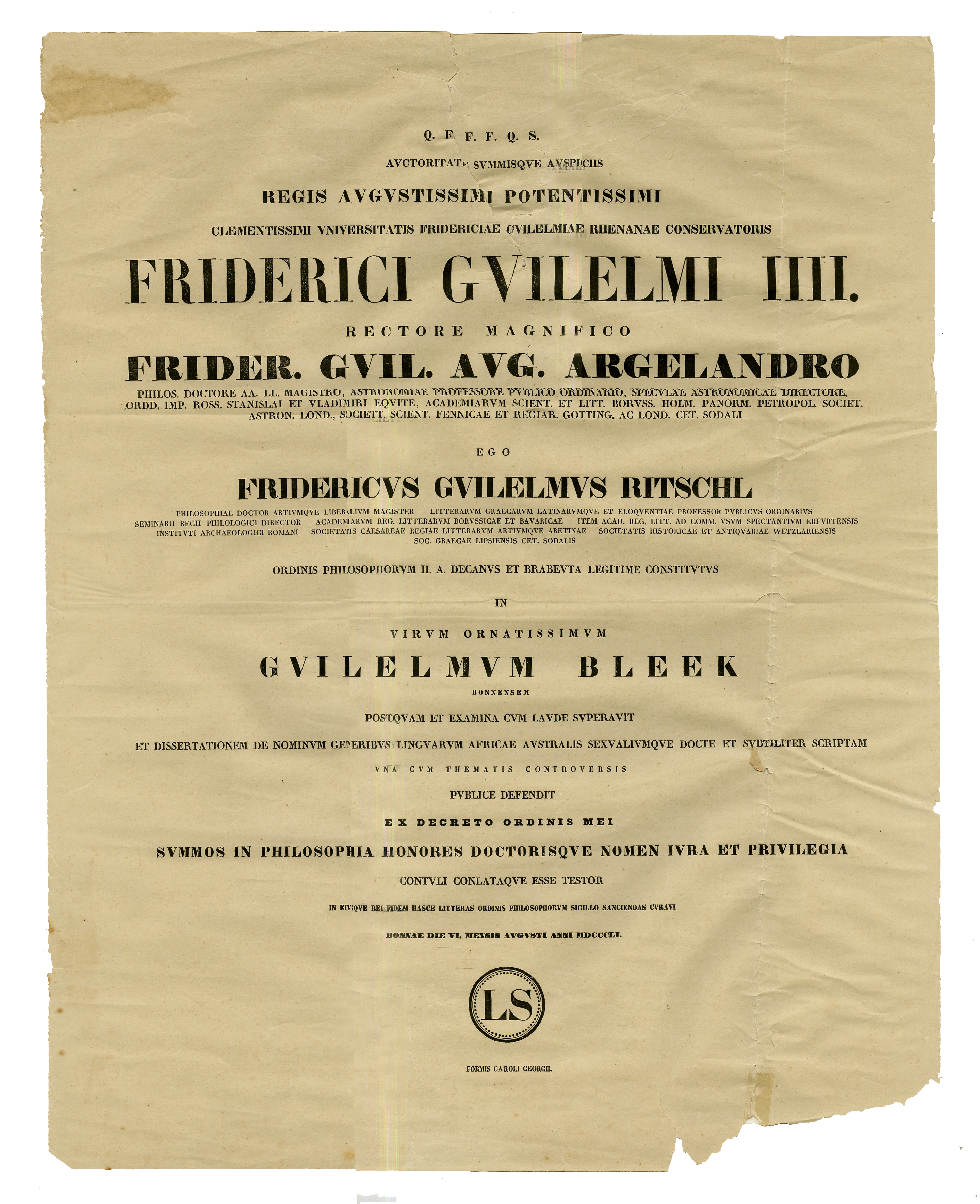 For eight years, Wilhelm Bleek (1827-1875) attended a gymnasium in Bonn. Bleek undertook tertiary studies from 1845 to 1851, enrolling with Bonn's theology faculty for his first course in the winter semester of 1845/6 (Bank, 2006: 15-16). He moved across to 'Berlin University' (i.e., the Friedrich Wilhelm University of Berlin) in his third year of undergraduate study, returning to Bonn in the summer semester of 1849 and concluding his 'final semester of formal study' there in the winter of 1850/1 (Bank, 2006: 18). Bleek graduated with a PhD in Linguistics from Bonn in 1851.