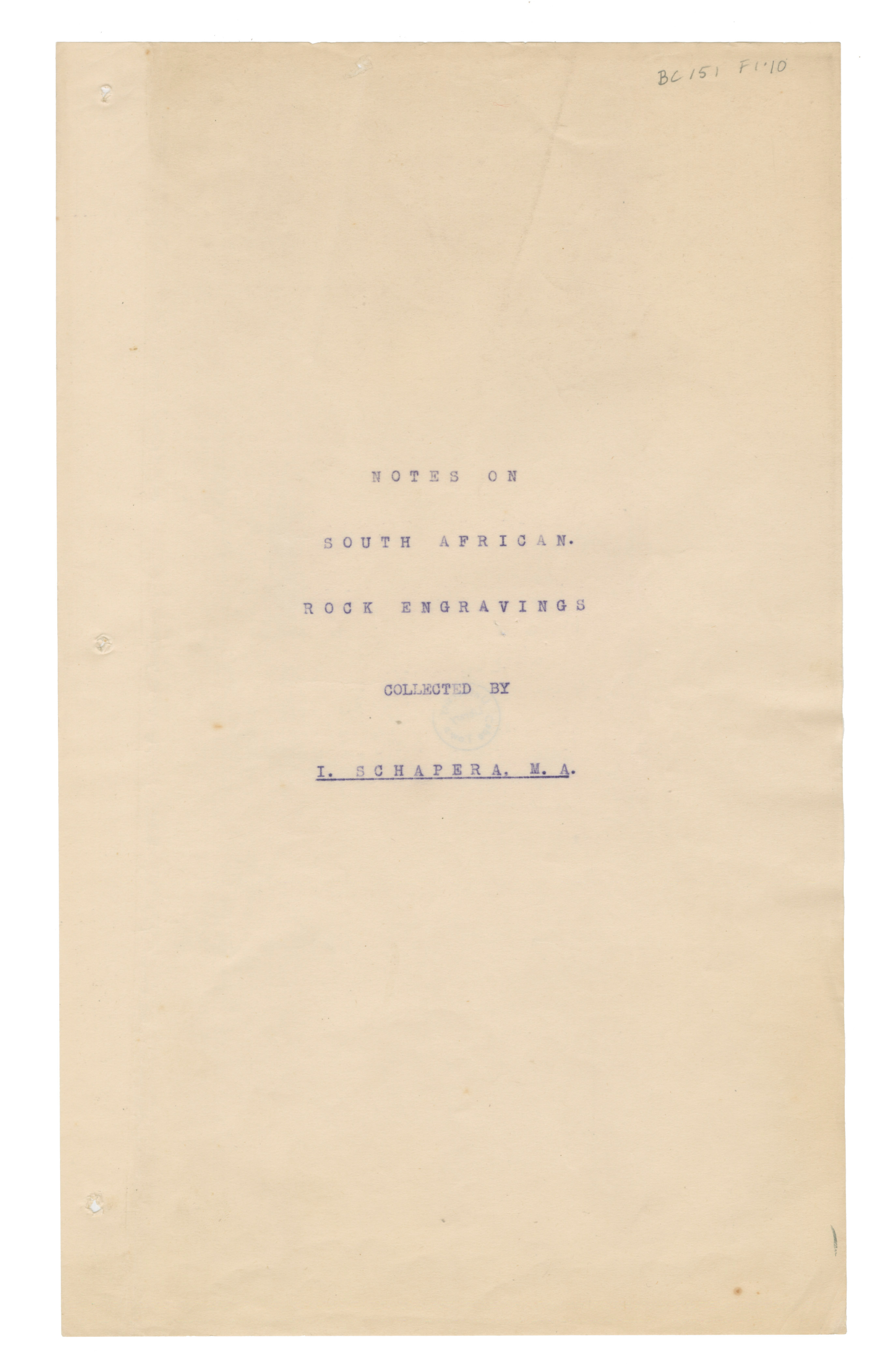 Notes on 'South African' rock engravings across southern Africa. UCT's BC 151 fonds description for this item (F1.10) connects it with the University of Cape Town's Department of Social Anthropology.