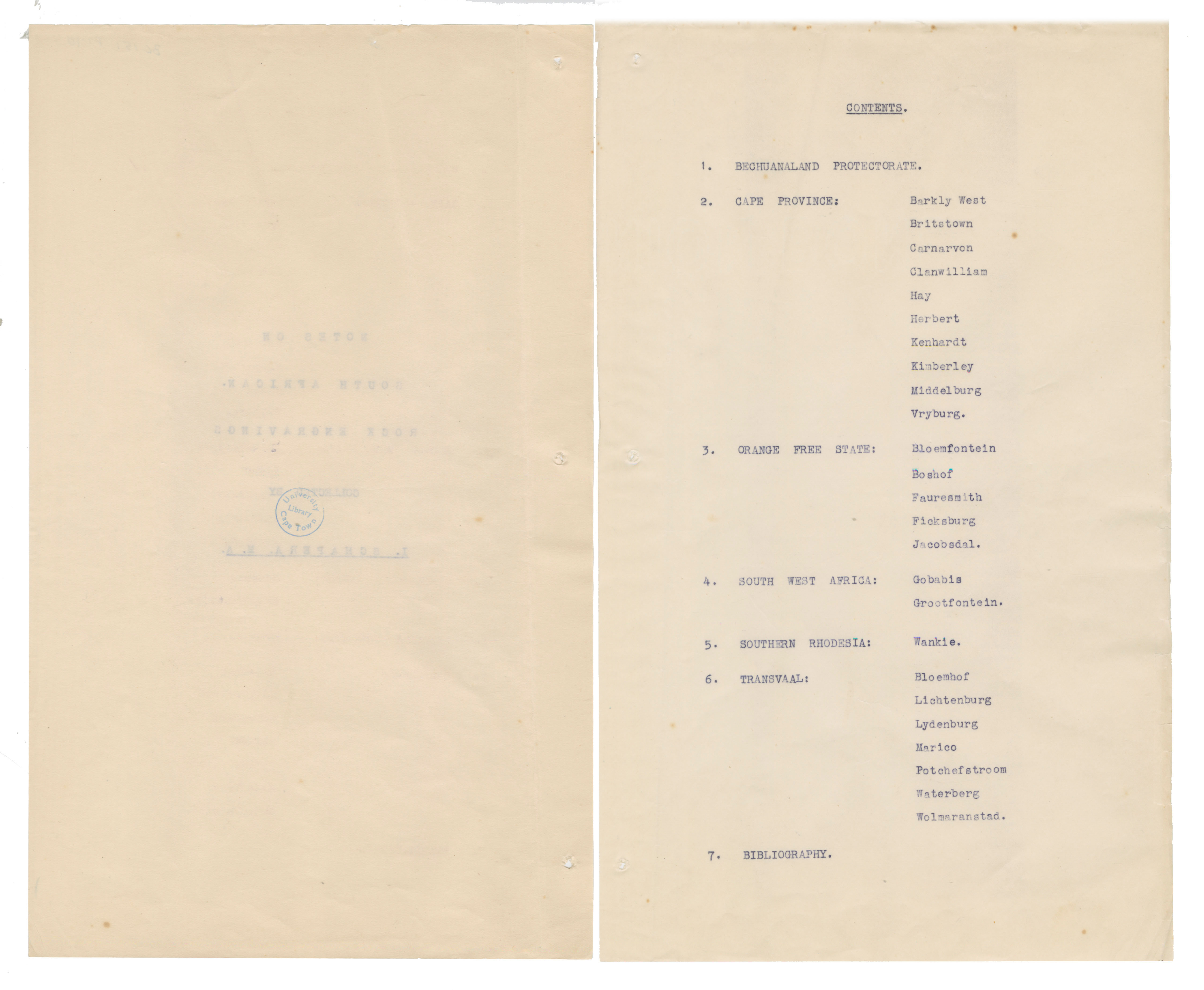 Notes on 'South African' rock engravings across southern Africa. UCT's BC 151 fonds description for this item (F1.10) connects it with the University of Cape Town's Department of Social Anthropology.