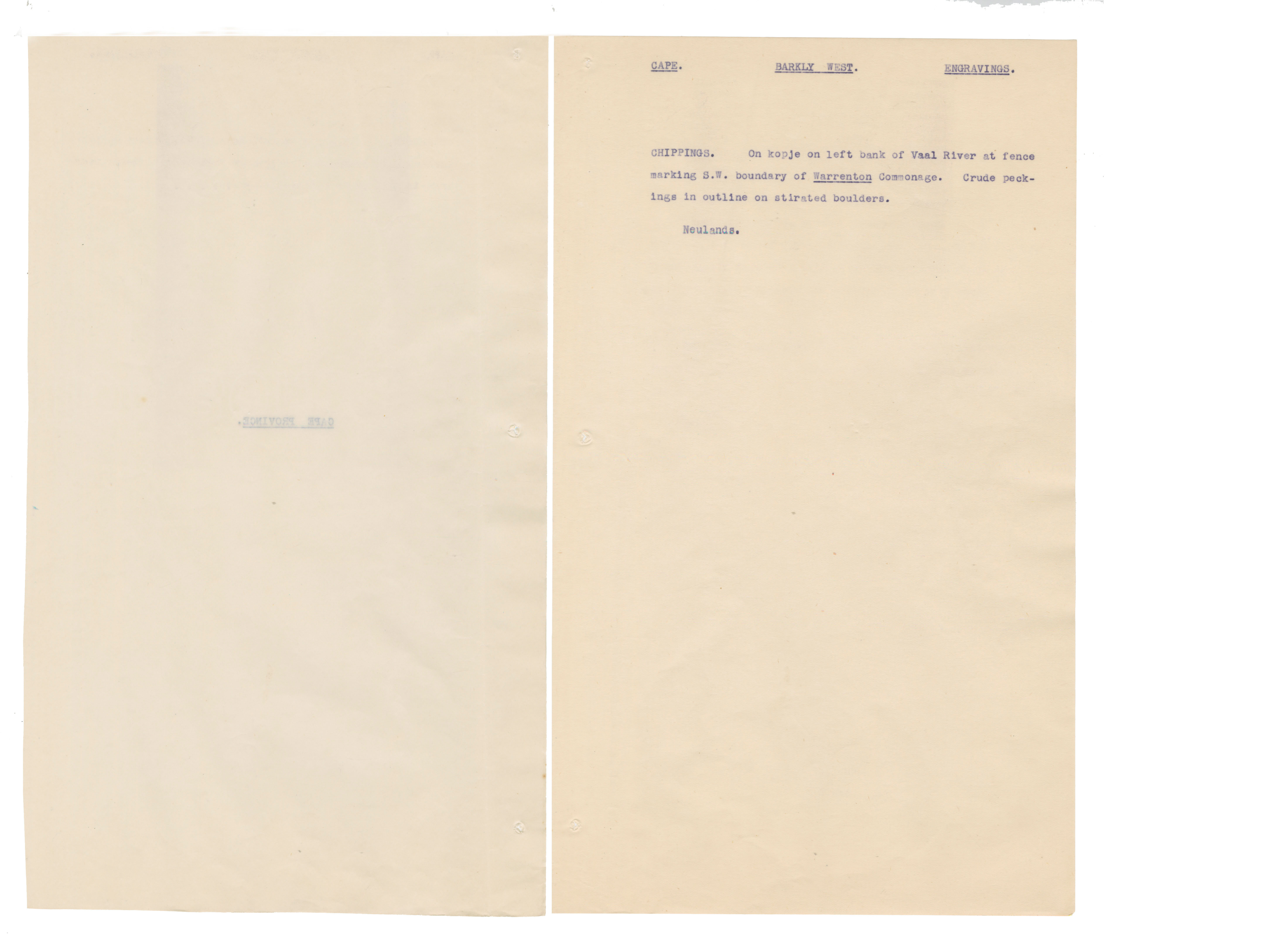 Typewritten notes (facsimiles?) on sheer paper about southern African rock engravings.