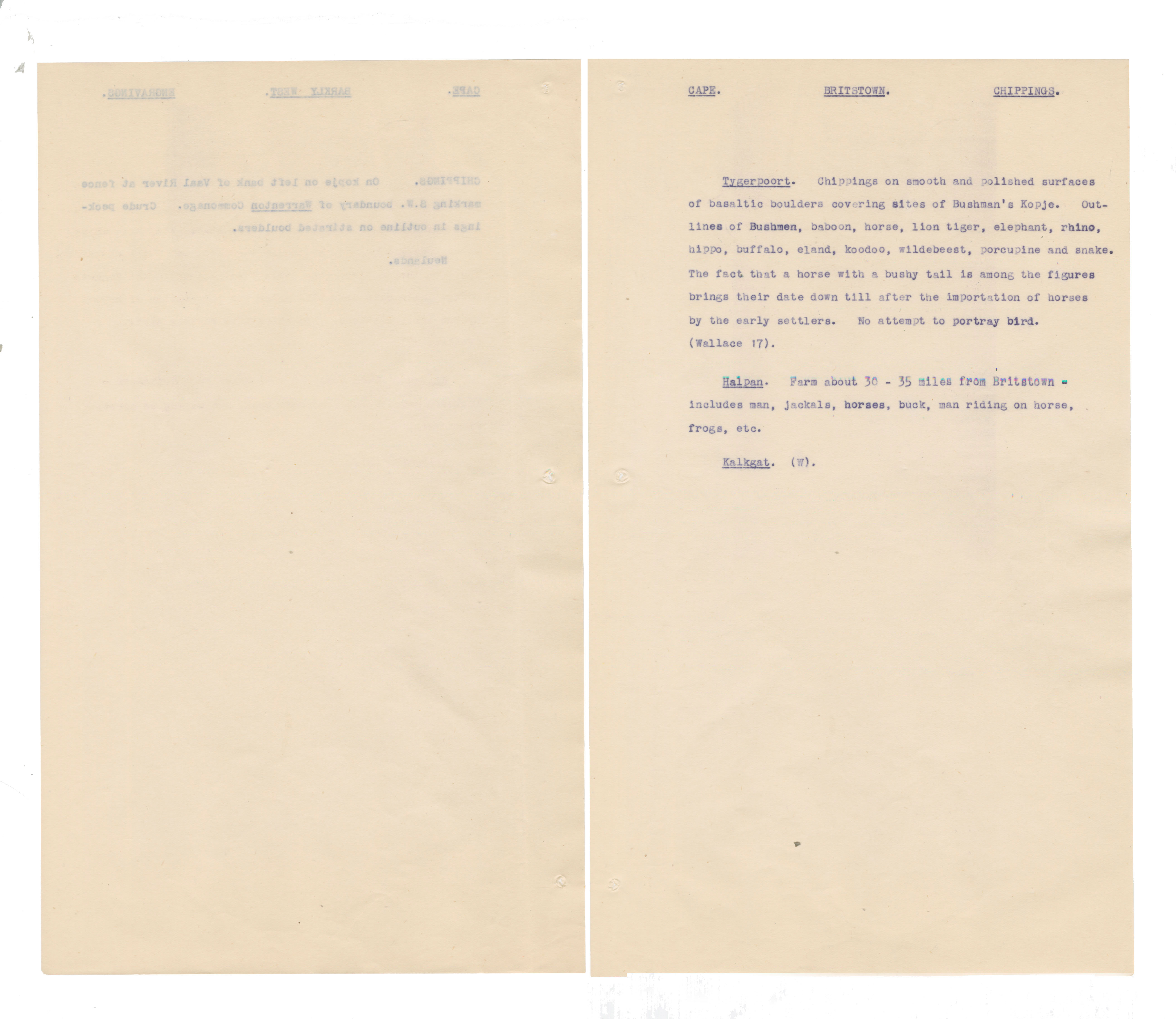 Typewritten notes (facsimiles?) on sheer paper about southern African rock engravings.
