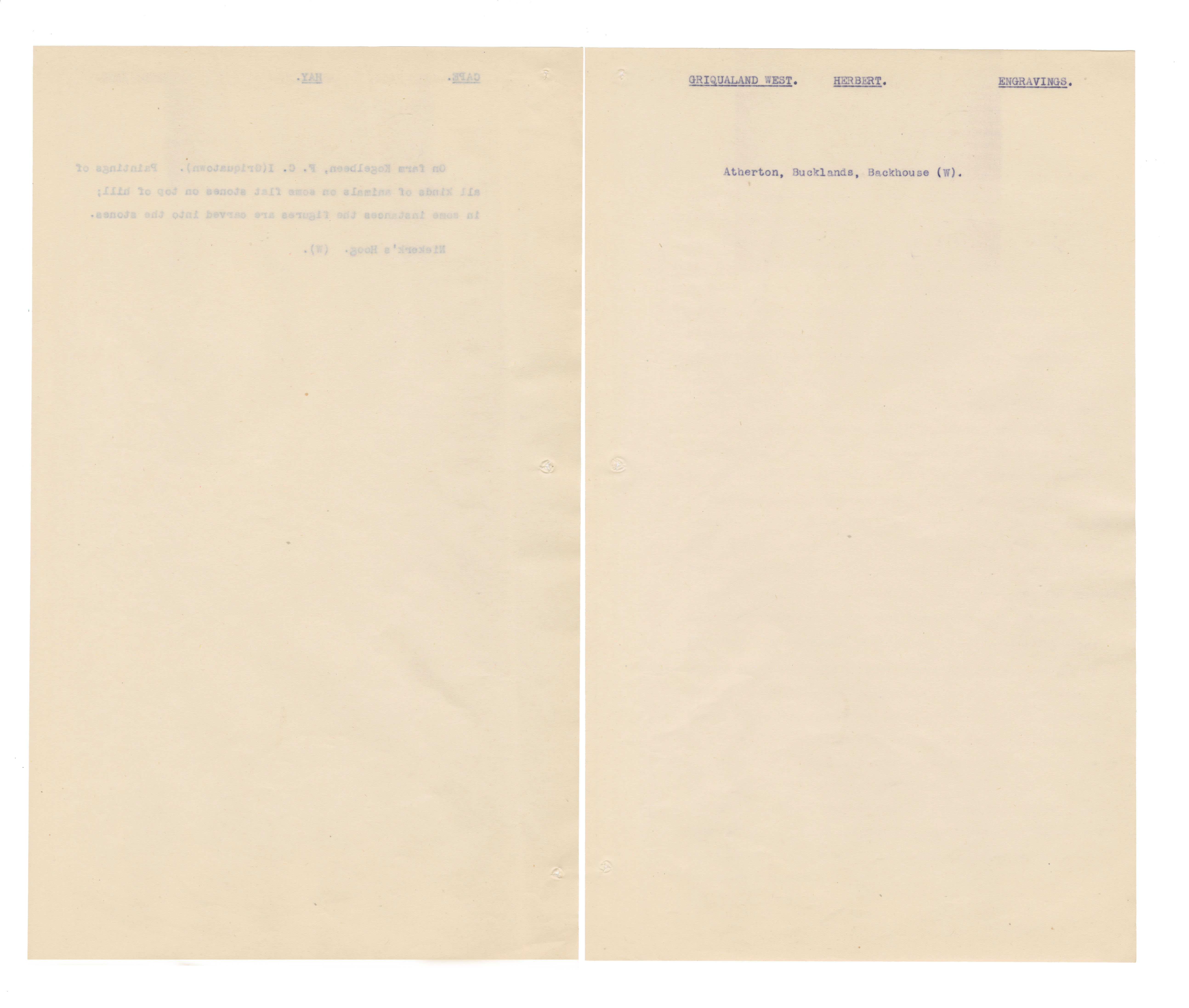 Typewritten notes (facsimiles?) on sheer paper about southern African rock engravings.
