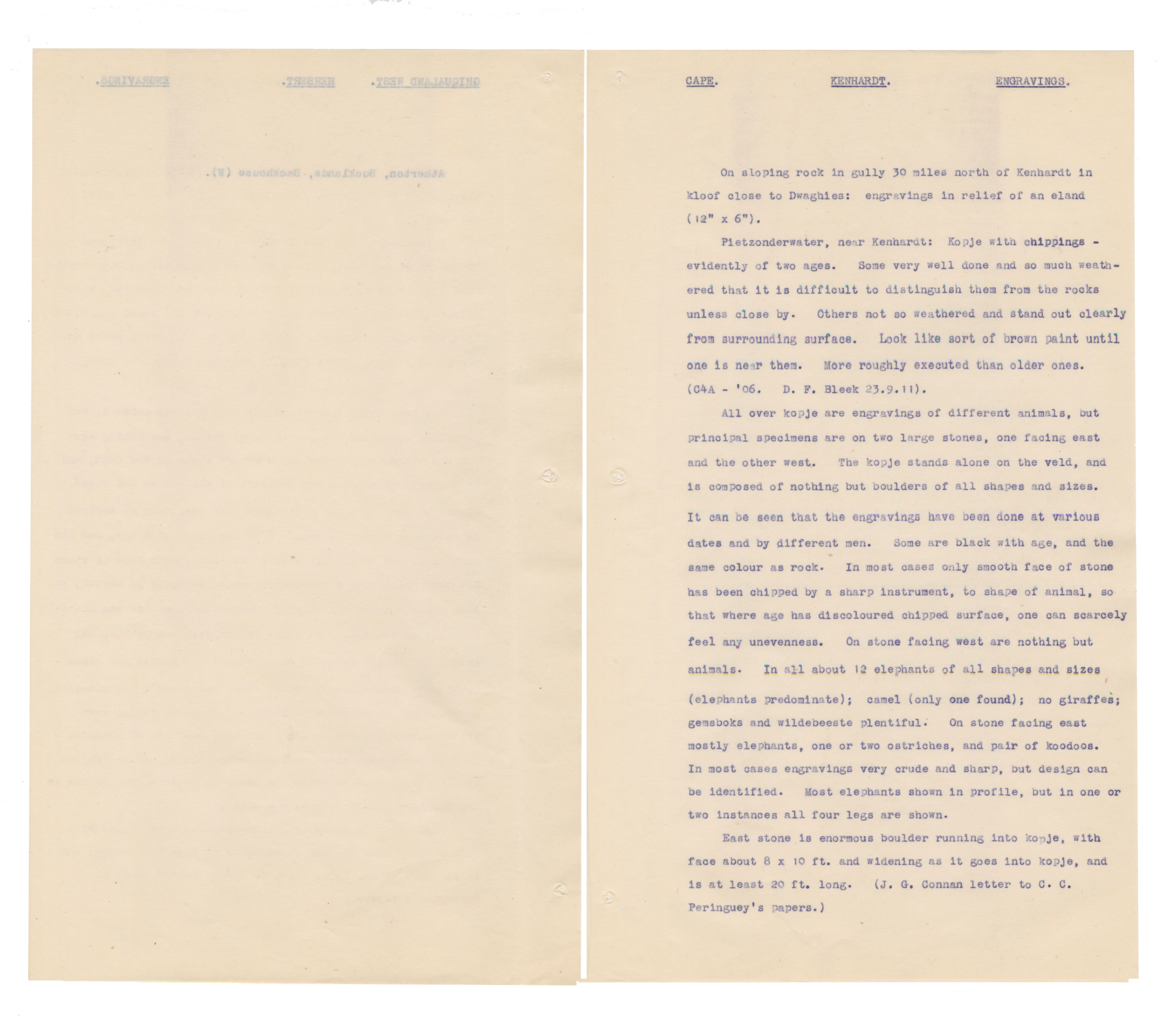 Typewritten notes (facsimiles?) on sheer paper about southern African rock engravings.