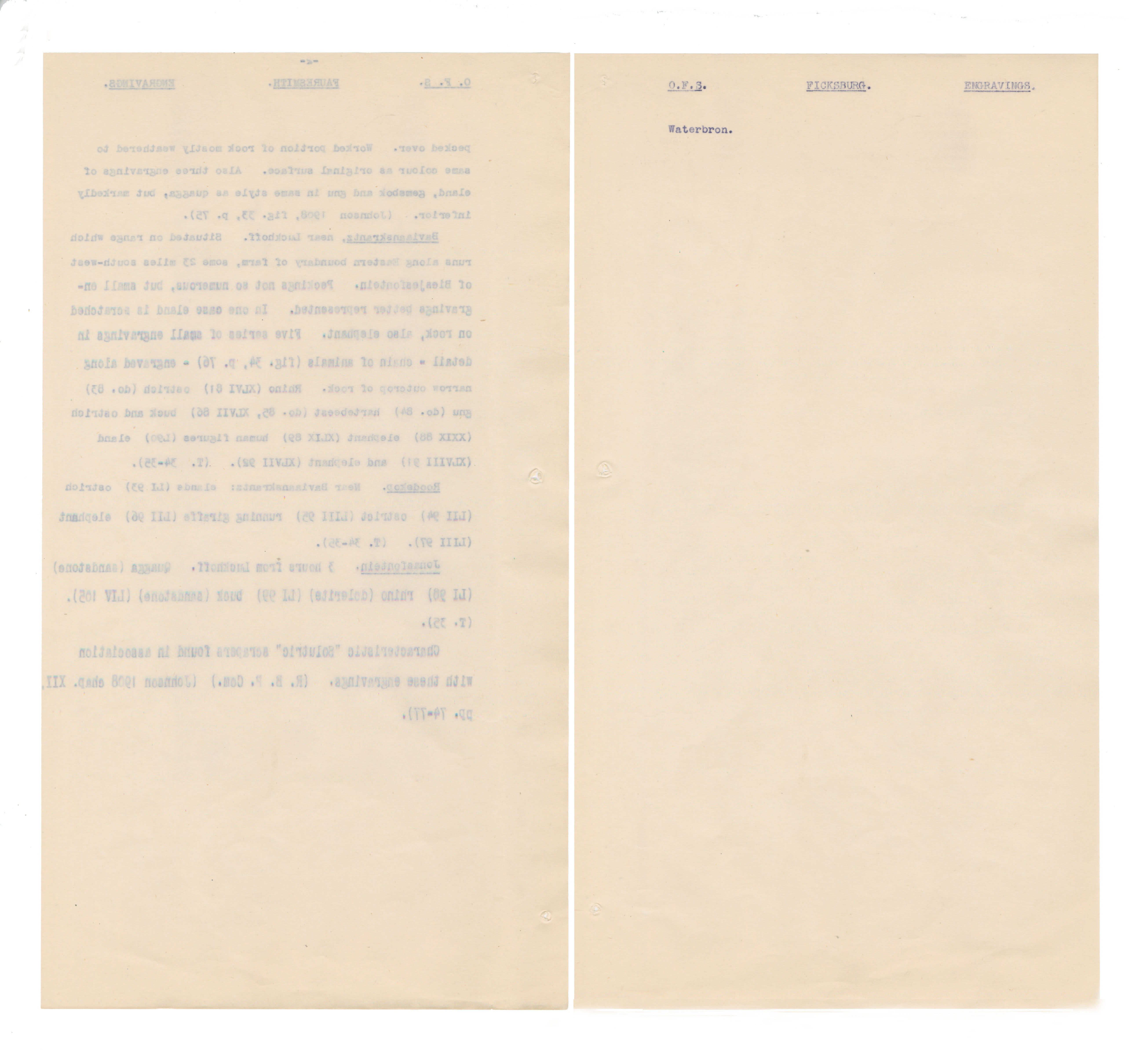 Typewritten notes (facsimiles?) on sheer paper about southern African rock engravings.
