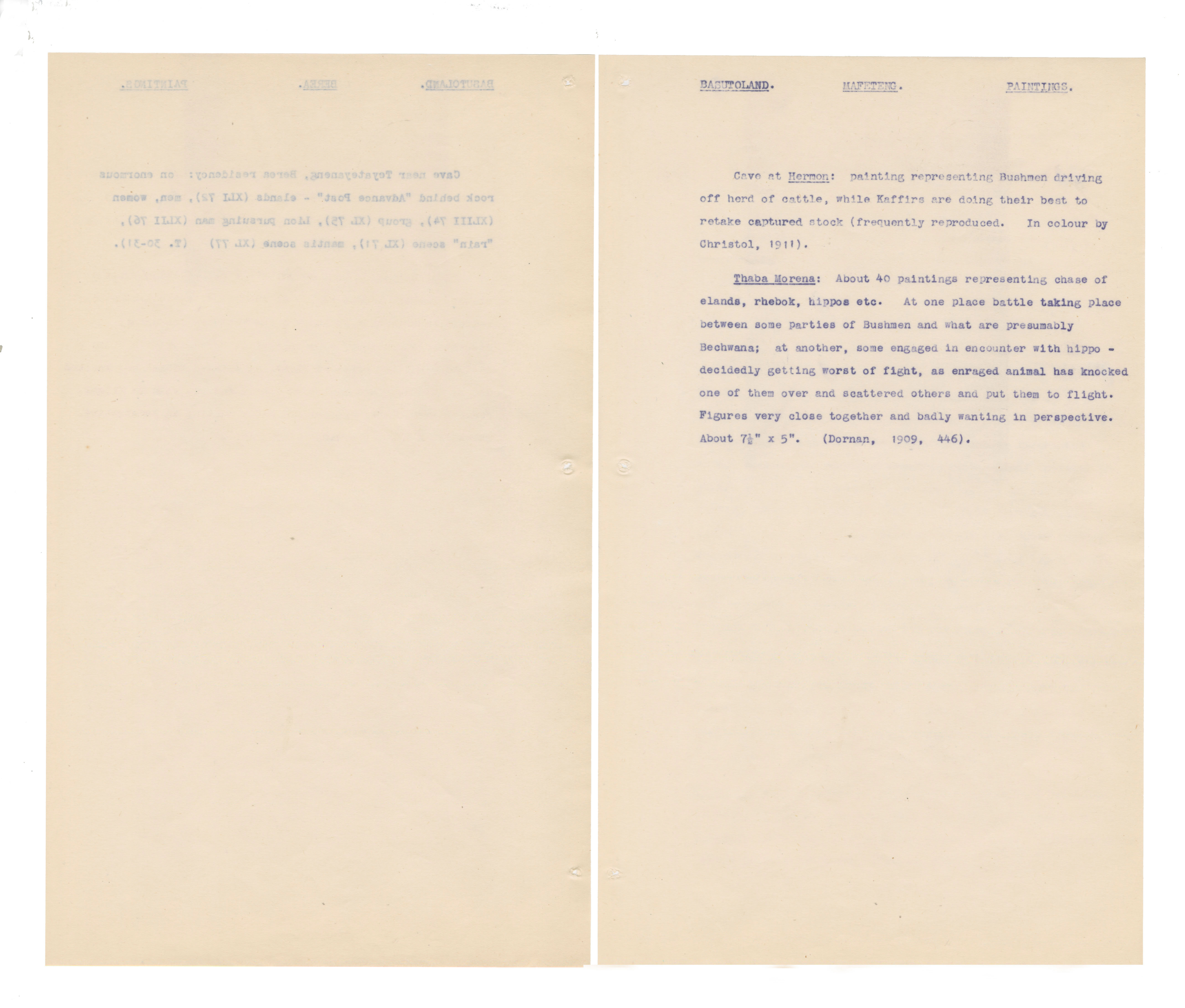 Typewritten notes (facsimiles?) on sheer paper about southern African rock engravings.