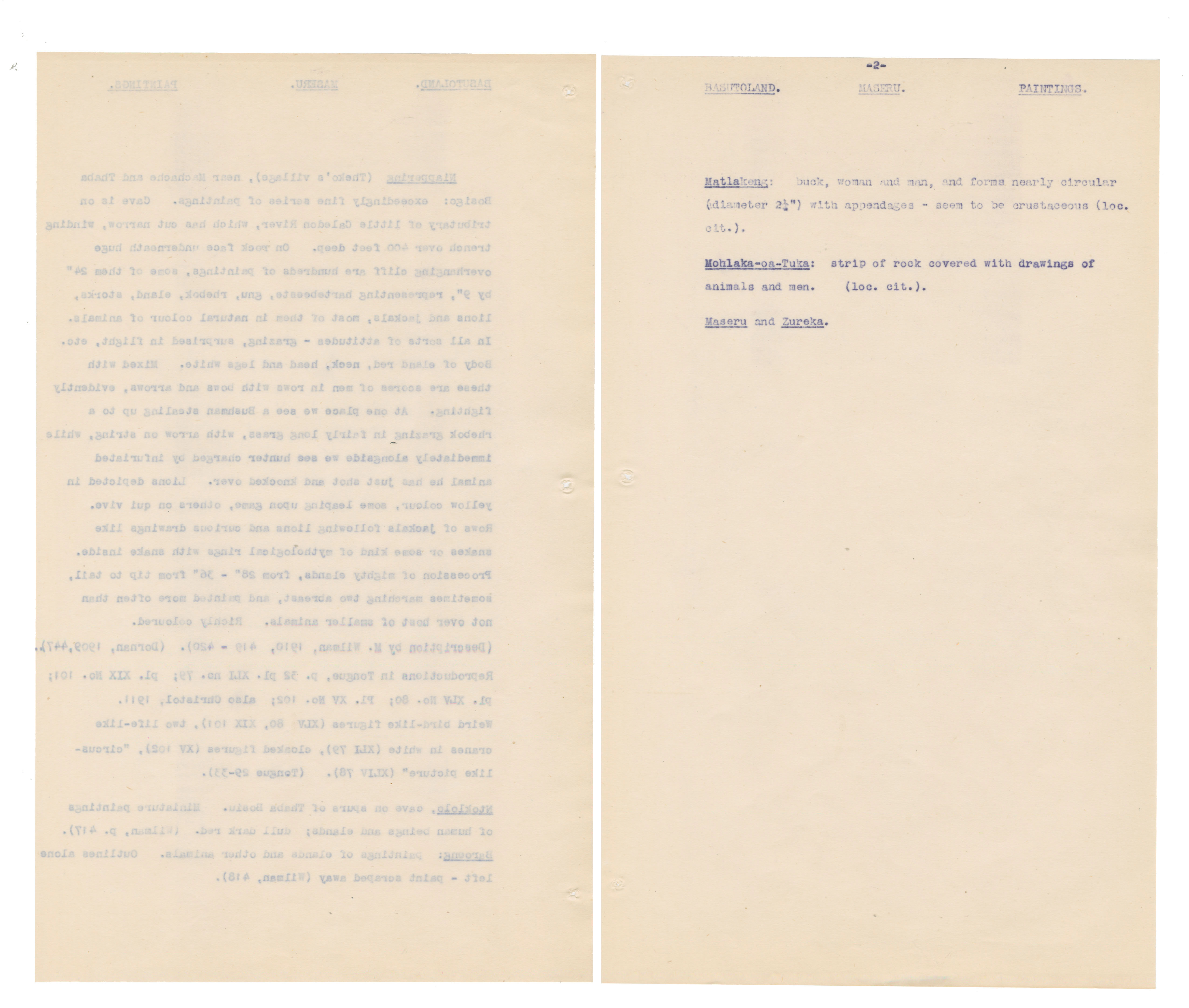 Typewritten notes (facsimiles?) on sheer paper about southern African rock engravings.