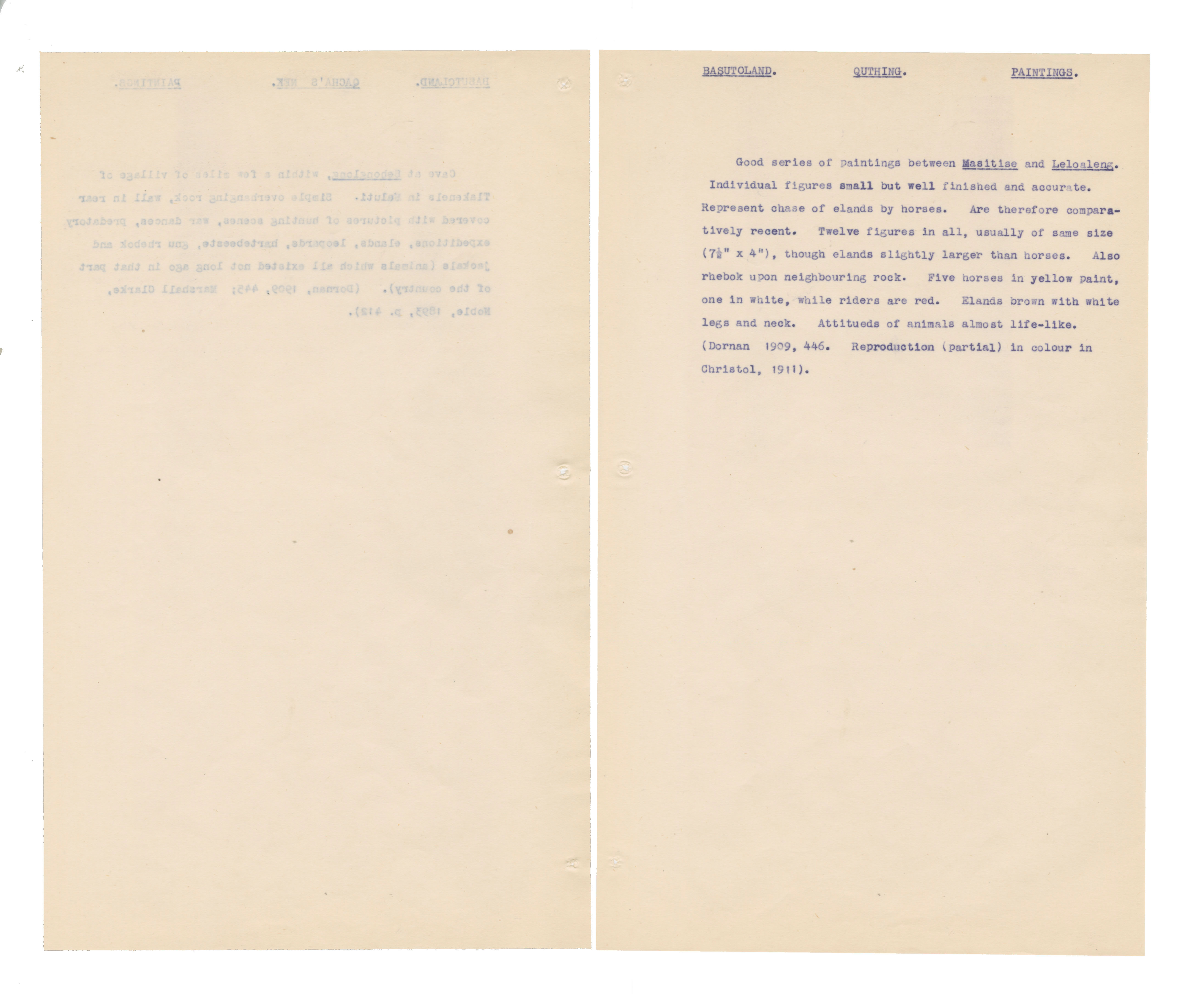 Typewritten notes (facsimiles?) on sheer paper about southern African rock engravings.
