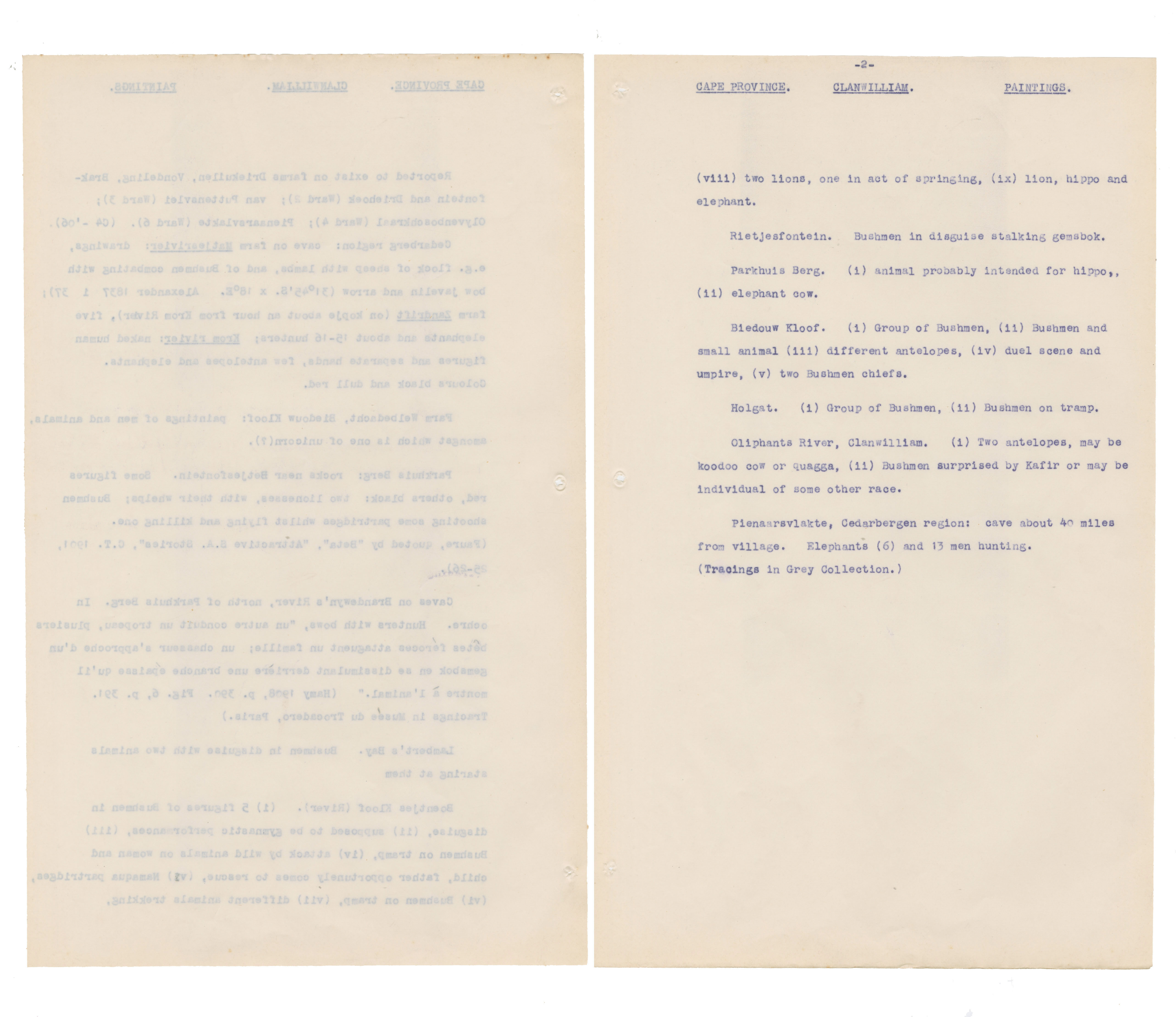 Typewritten notes (facsimiles?) on sheer paper about southern African rock engravings.
