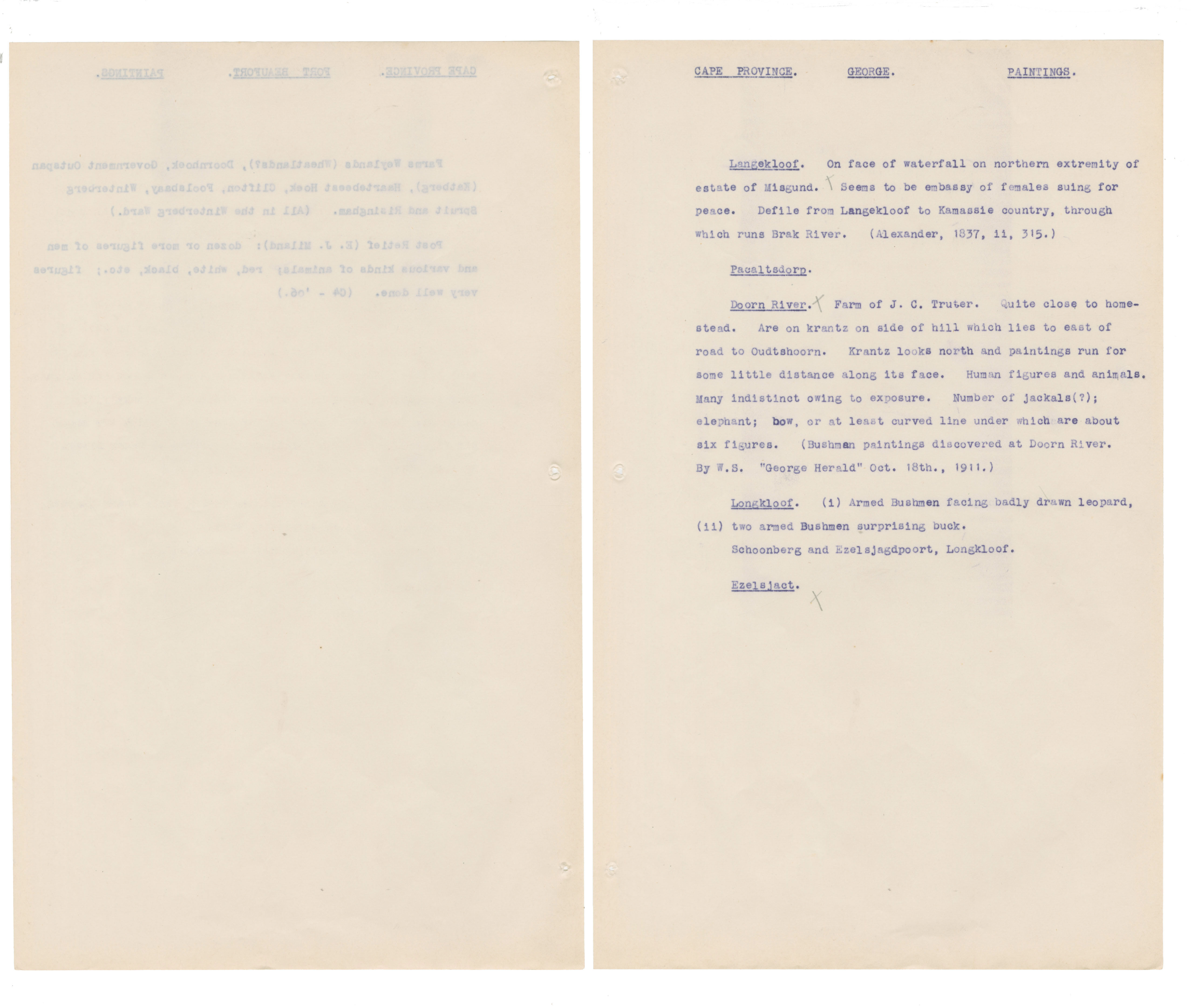 Typewritten notes (facsimiles?) on sheer paper about southern African rock engravings.