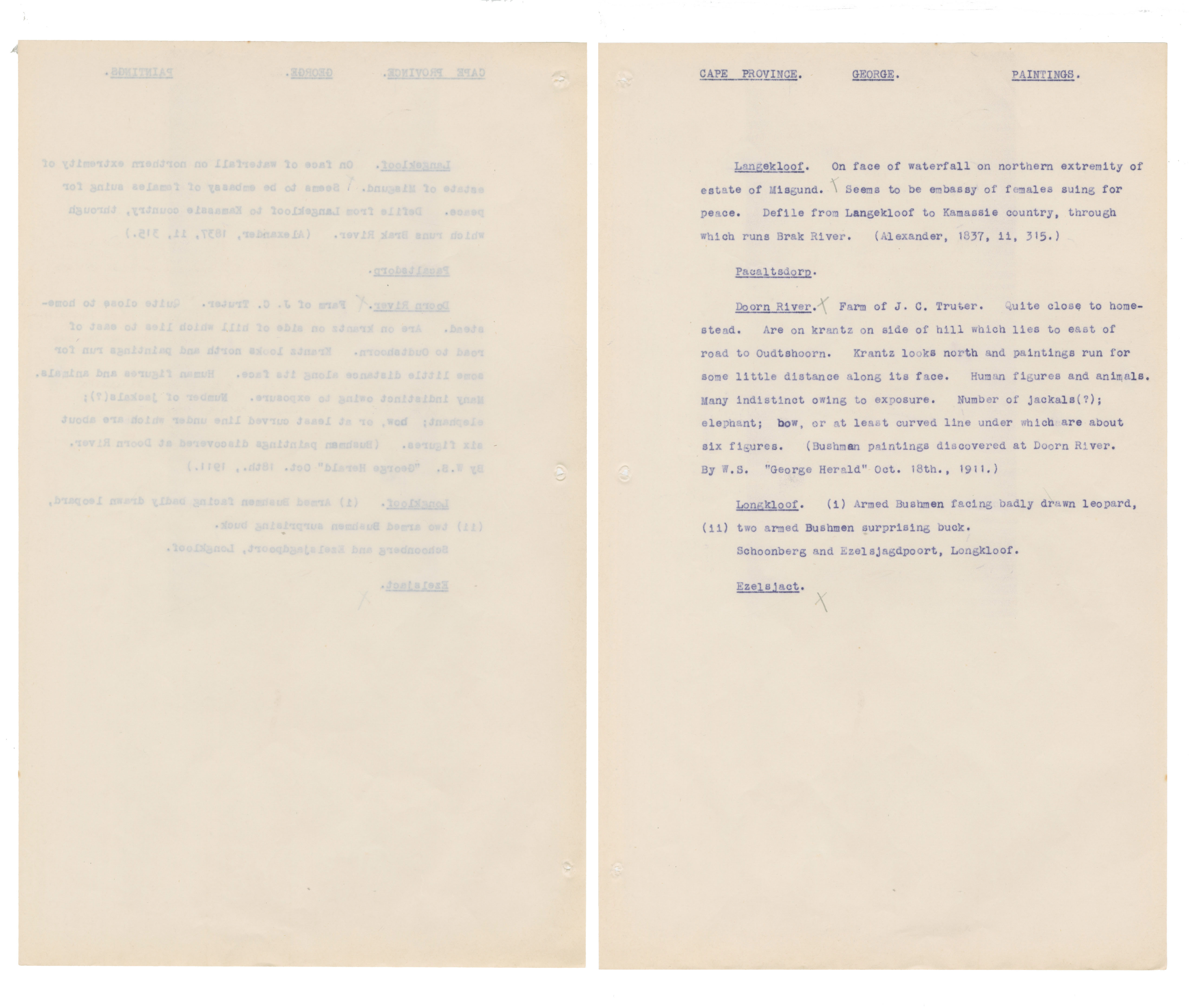 Typewritten notes (facsimiles?) on sheer paper about southern African rock engravings.