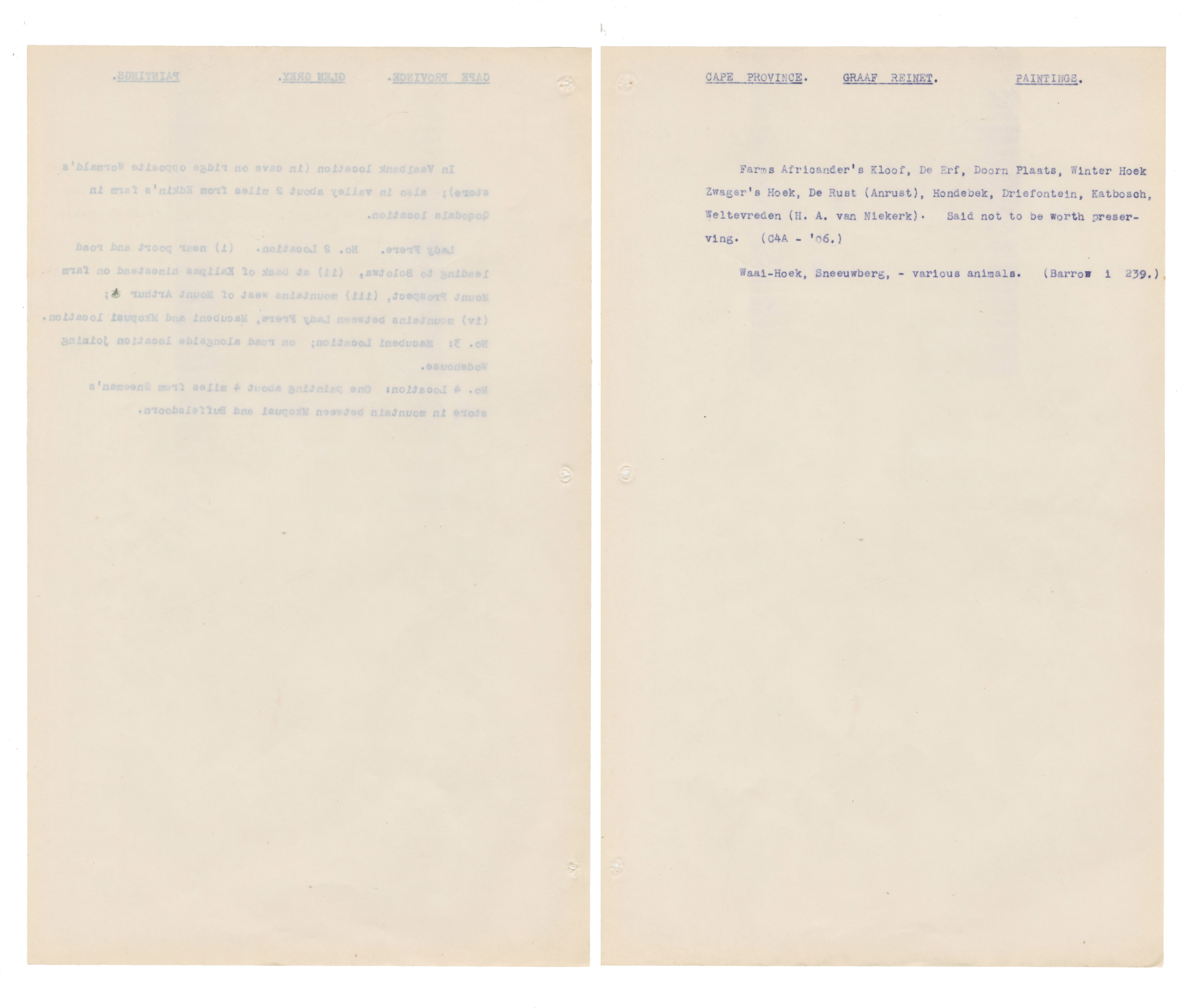 Typewritten notes (facsimiles?) on sheer paper about southern African rock engravings.
