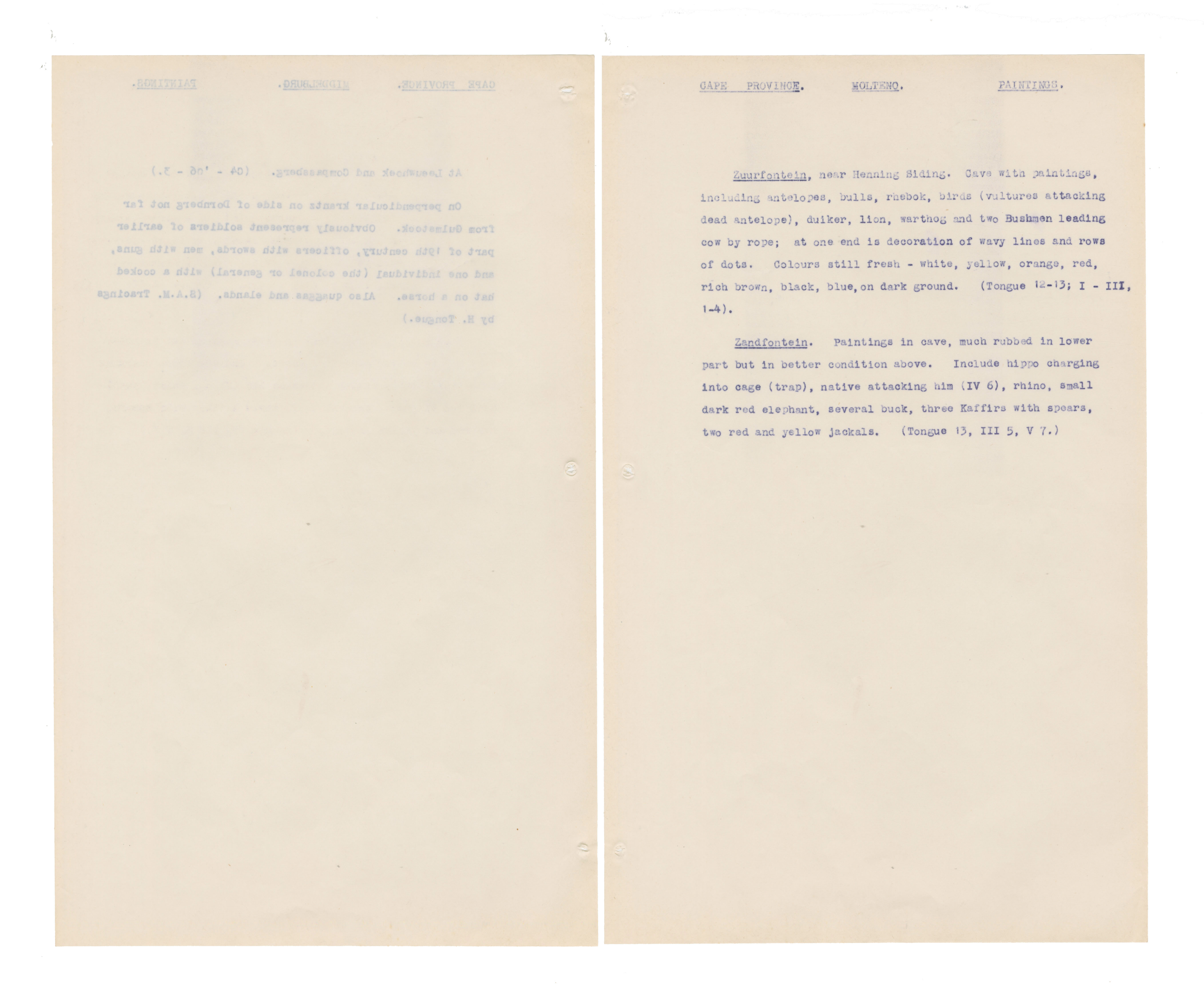 Typewritten notes (facsimiles?) on sheer paper about southern African rock engravings.