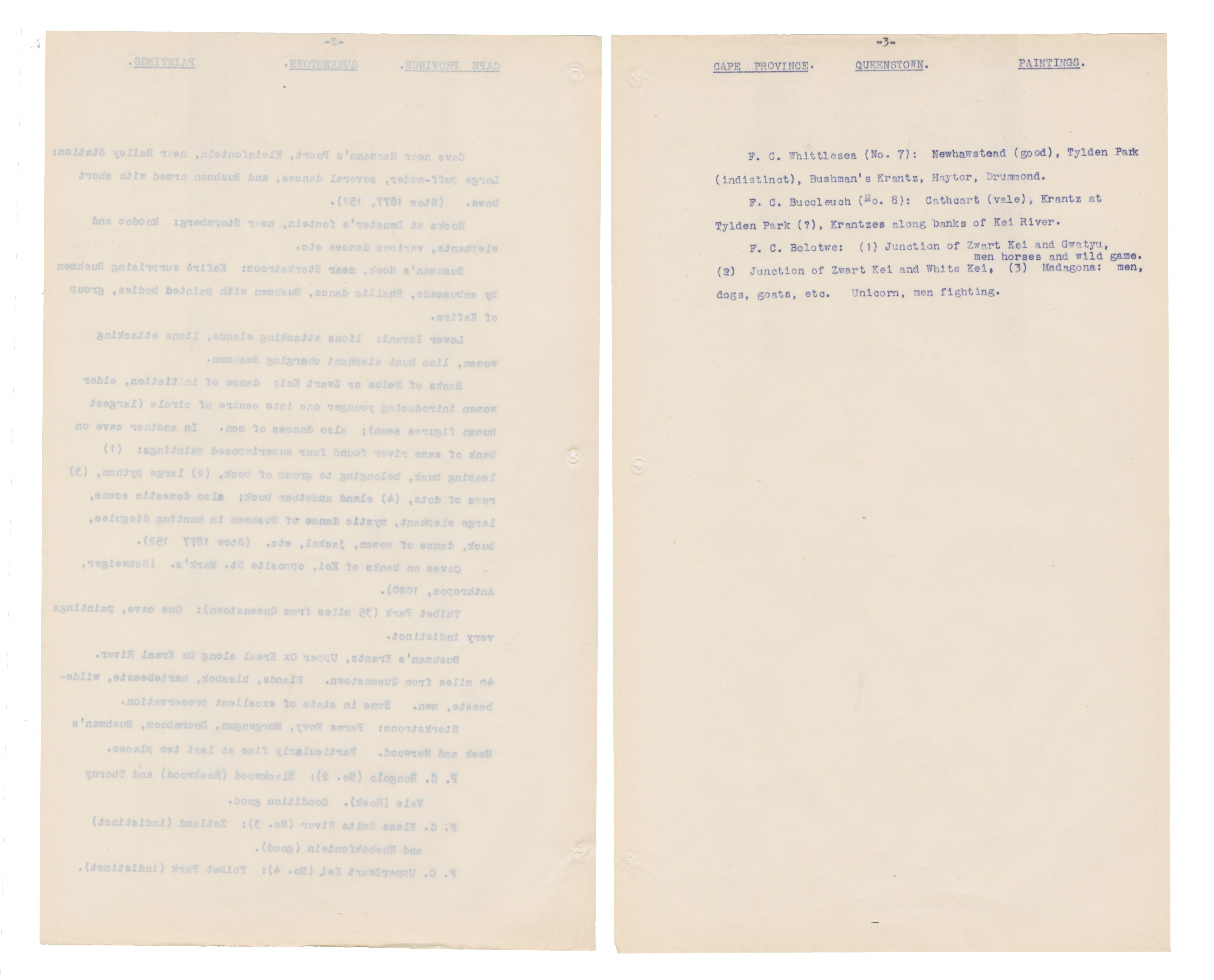 Typewritten notes (facsimiles?) on sheer paper about southern African rock engravings.