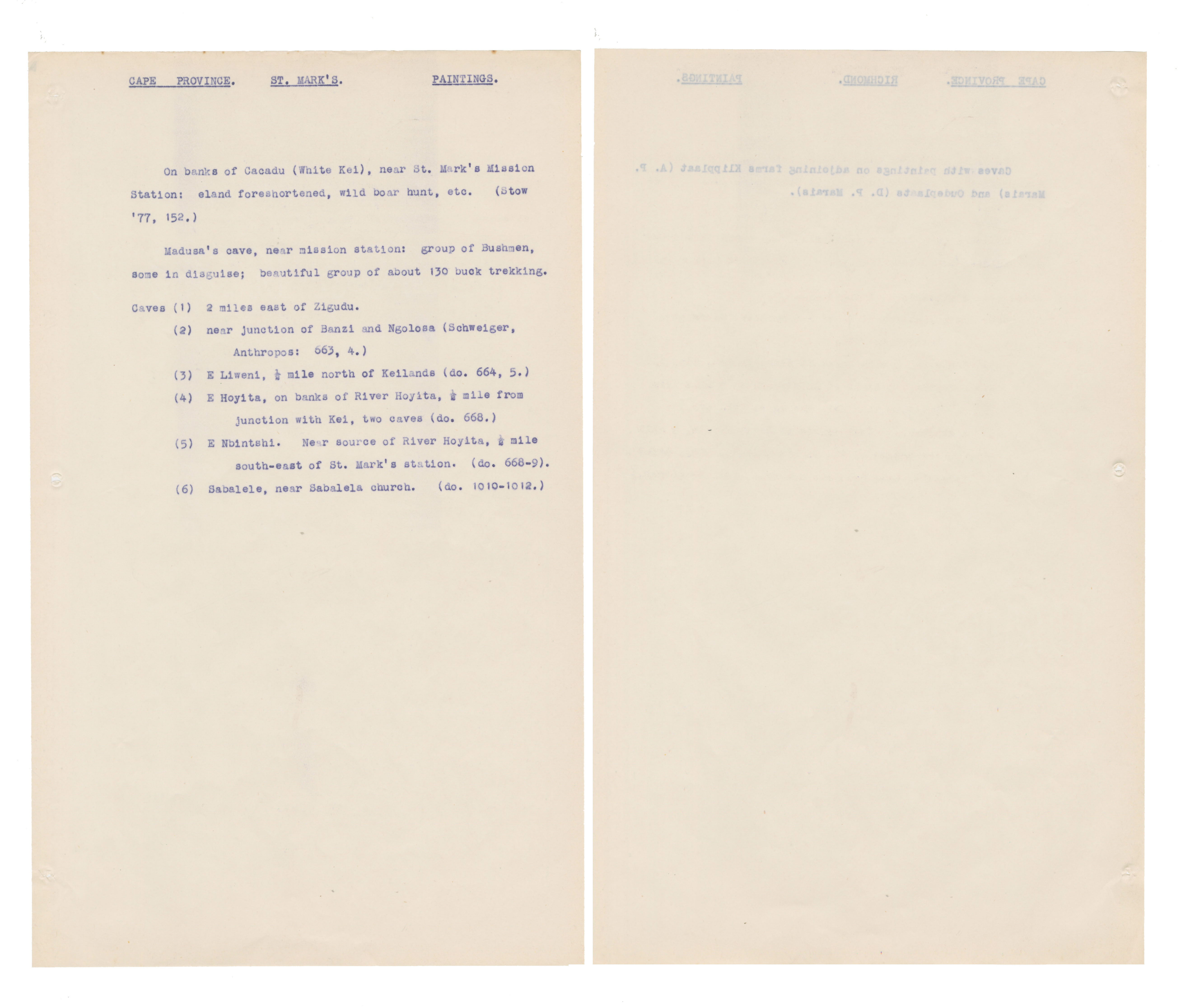 Notes on 'South African' rock engravings across southern Africa. UCT's BC 151 fonds description for this item (F1.10) connects it with the University of Cape Town's Department of Social Anthropology.