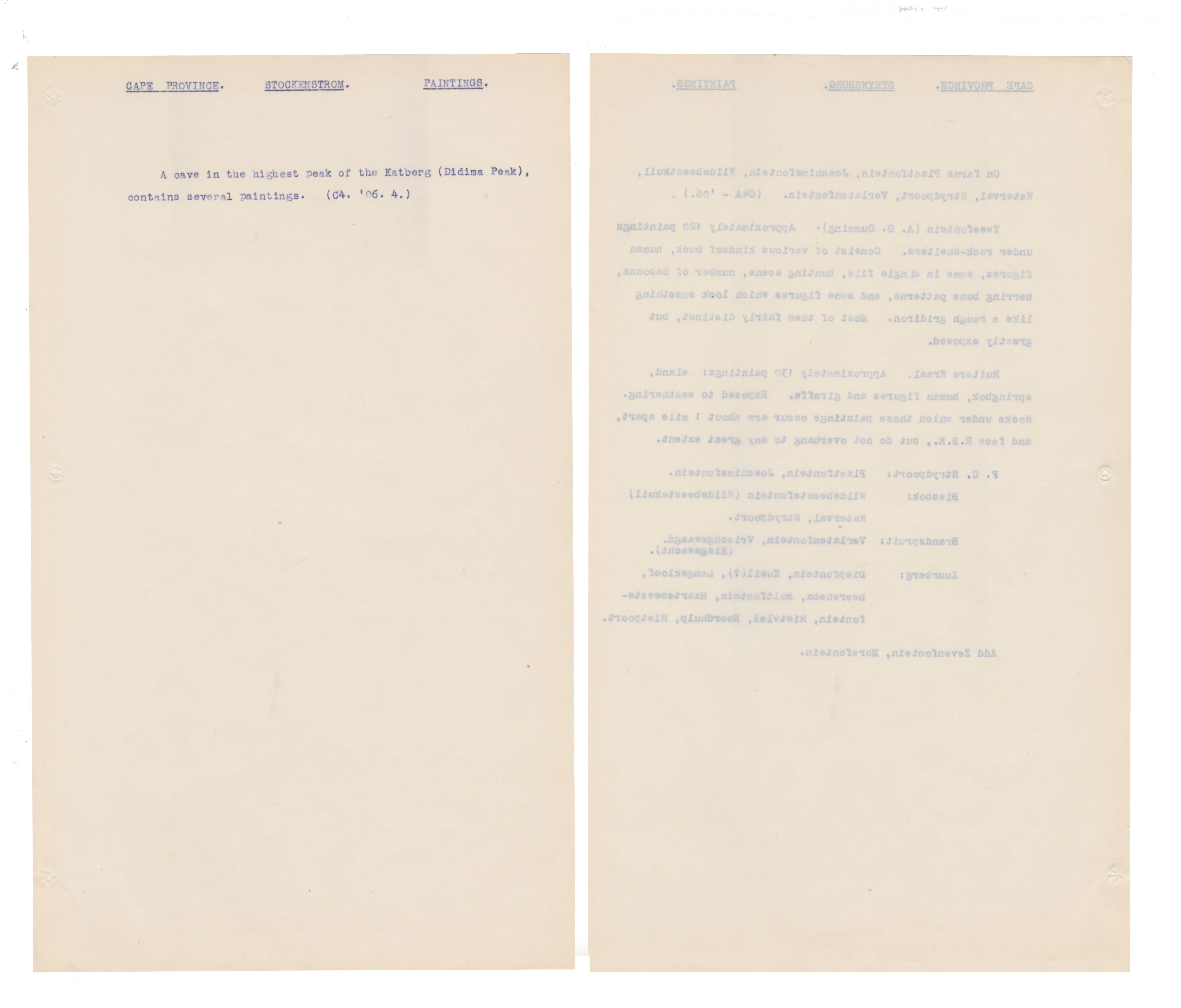 Typewritten notes (facsimiles?) on sheer paper about southern African rock engravings.