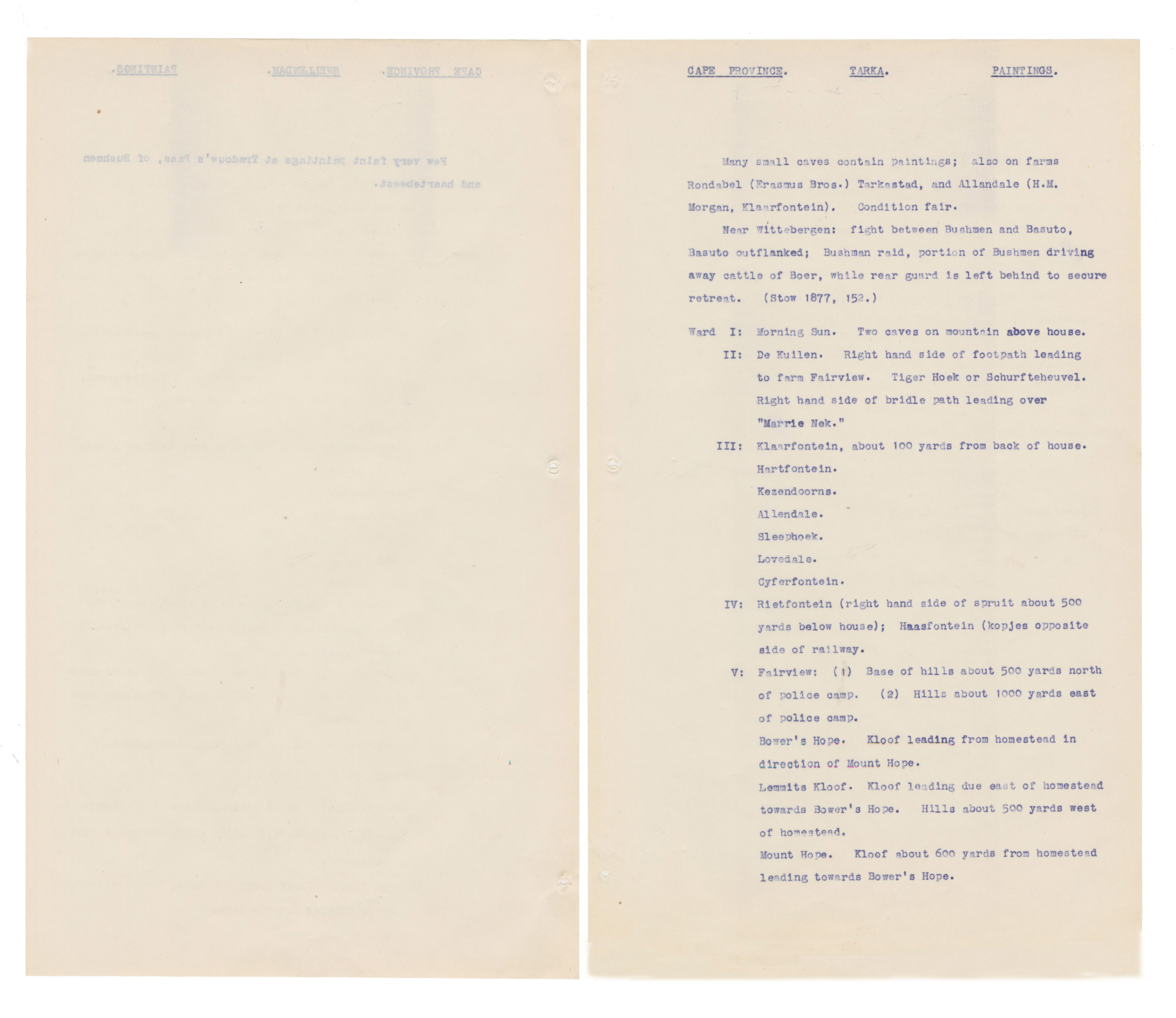 Typewritten notes (facsimiles?) on sheer paper about southern African rock engravings.