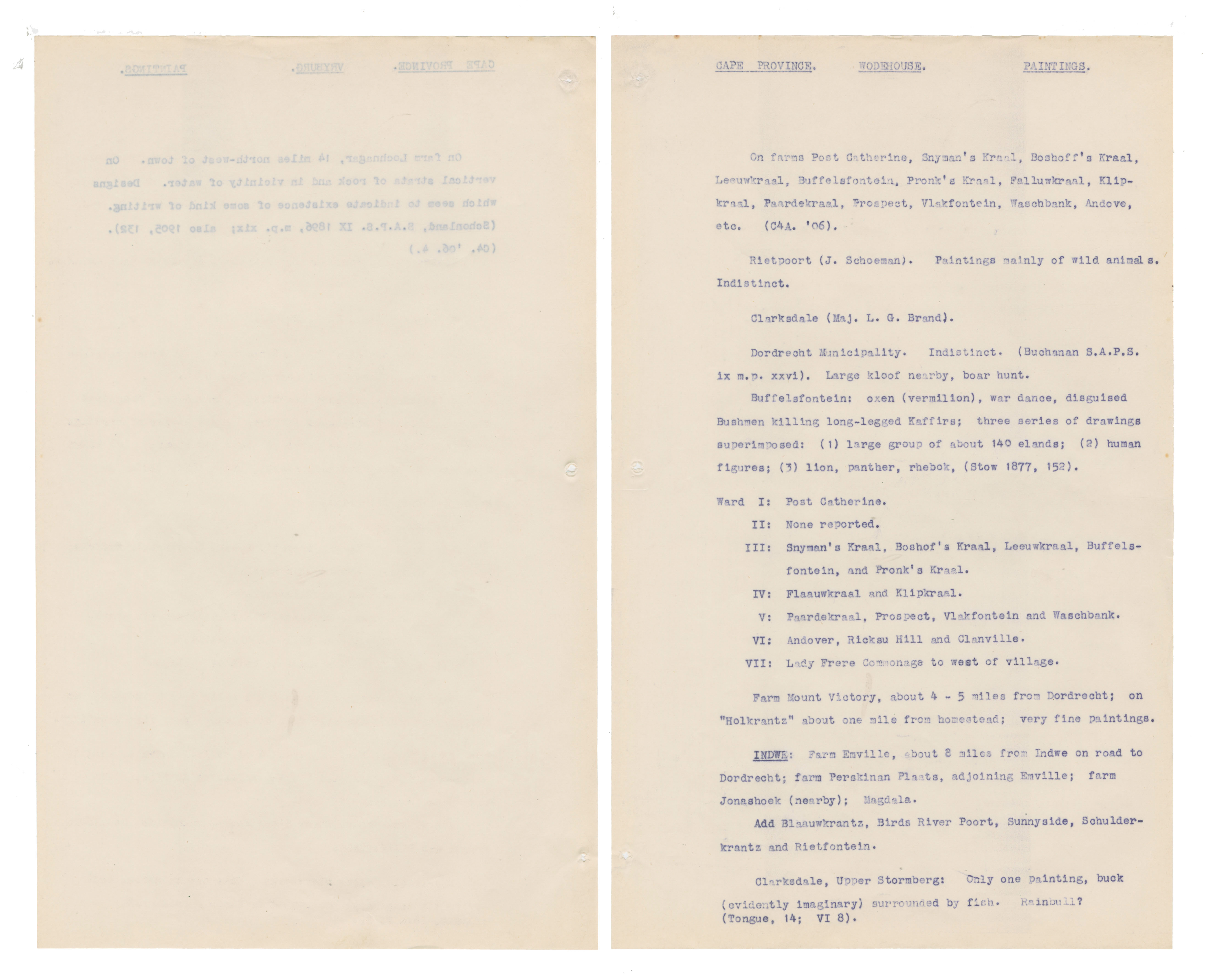 Typewritten notes (facsimiles?) on sheer paper about southern African rock engravings.