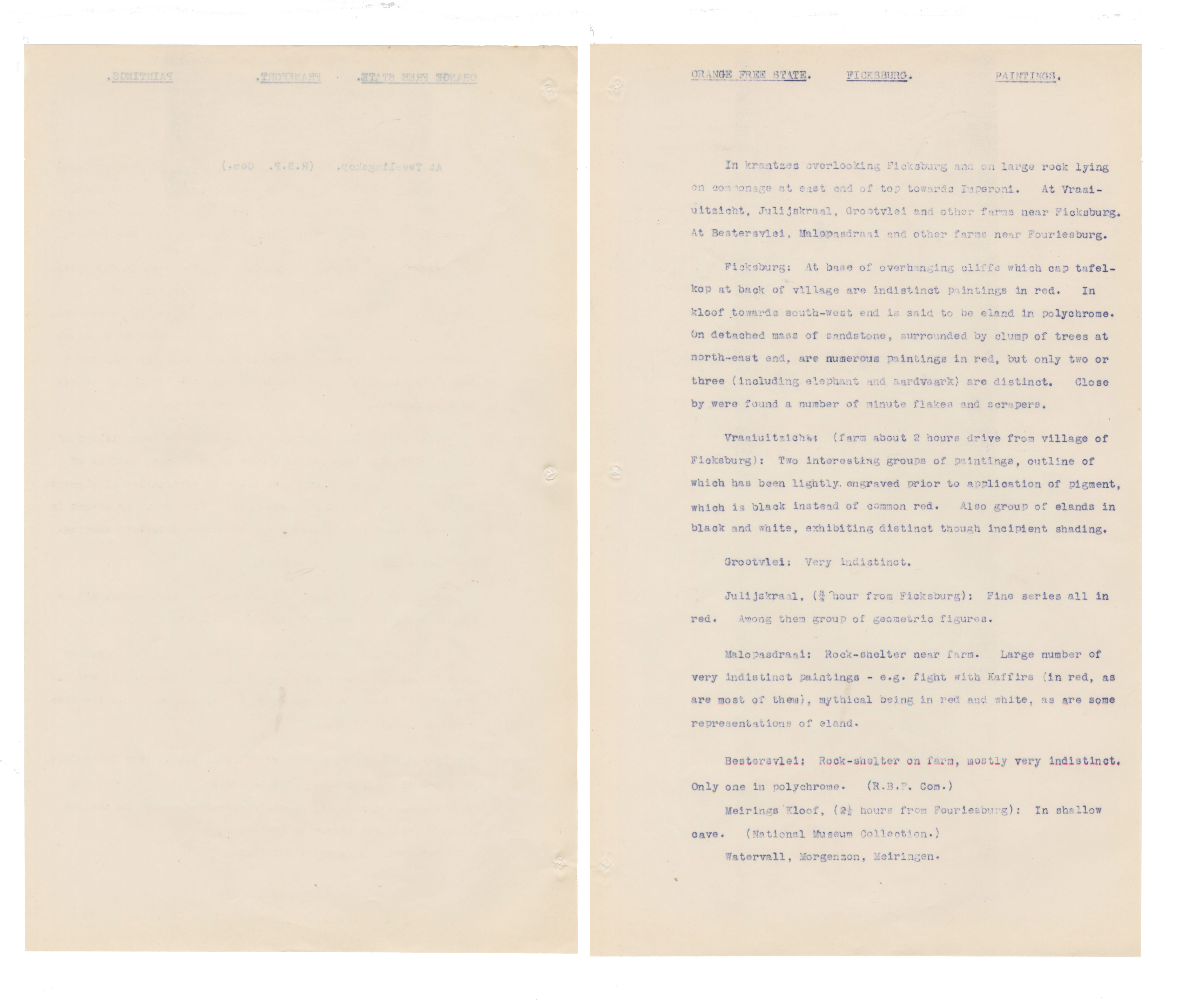 Typewritten notes (facsimiles?) on sheer paper about southern African rock engravings.