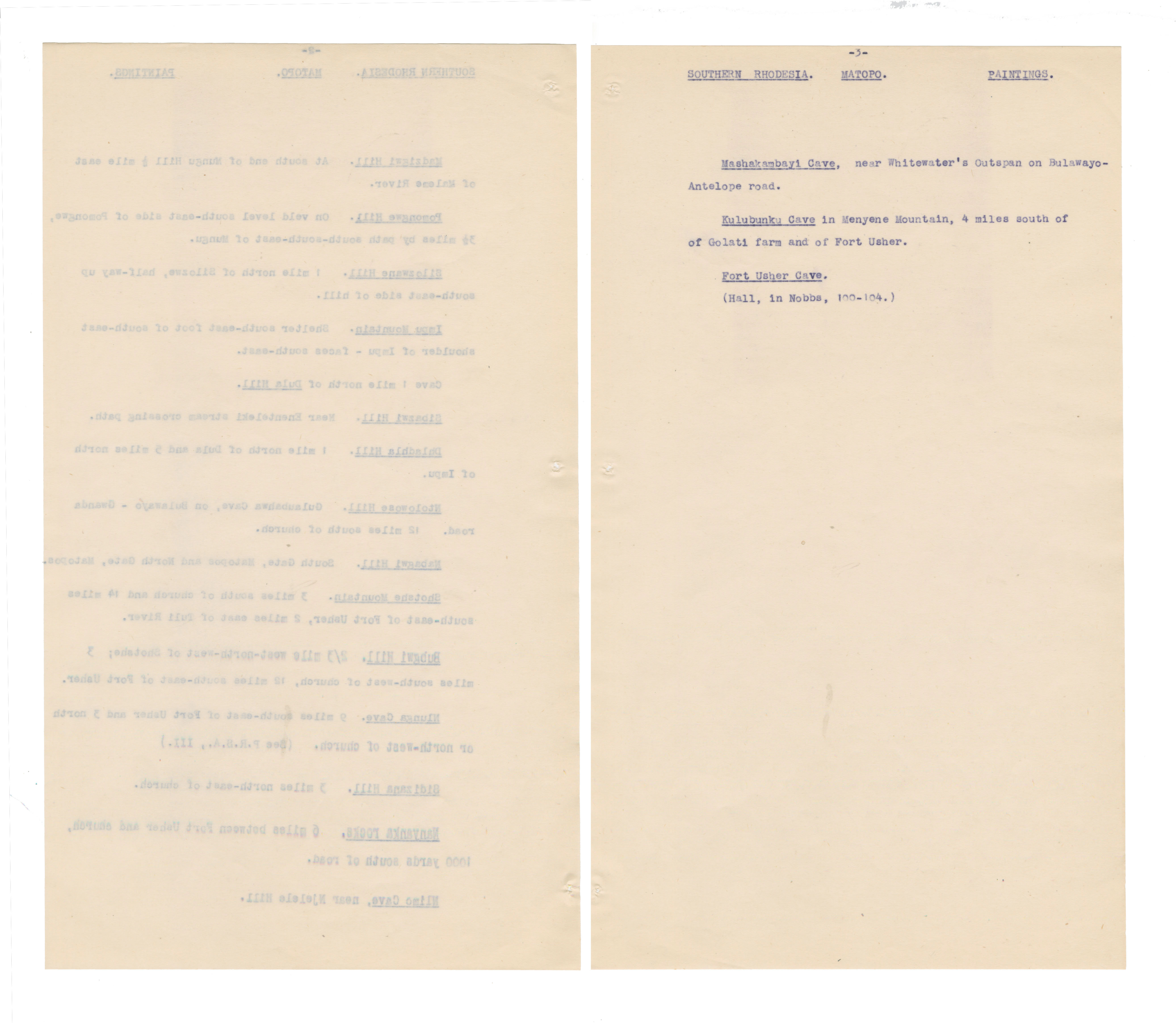 Typewritten notes (facsimiles?) on sheer paper about southern African rock engravings.