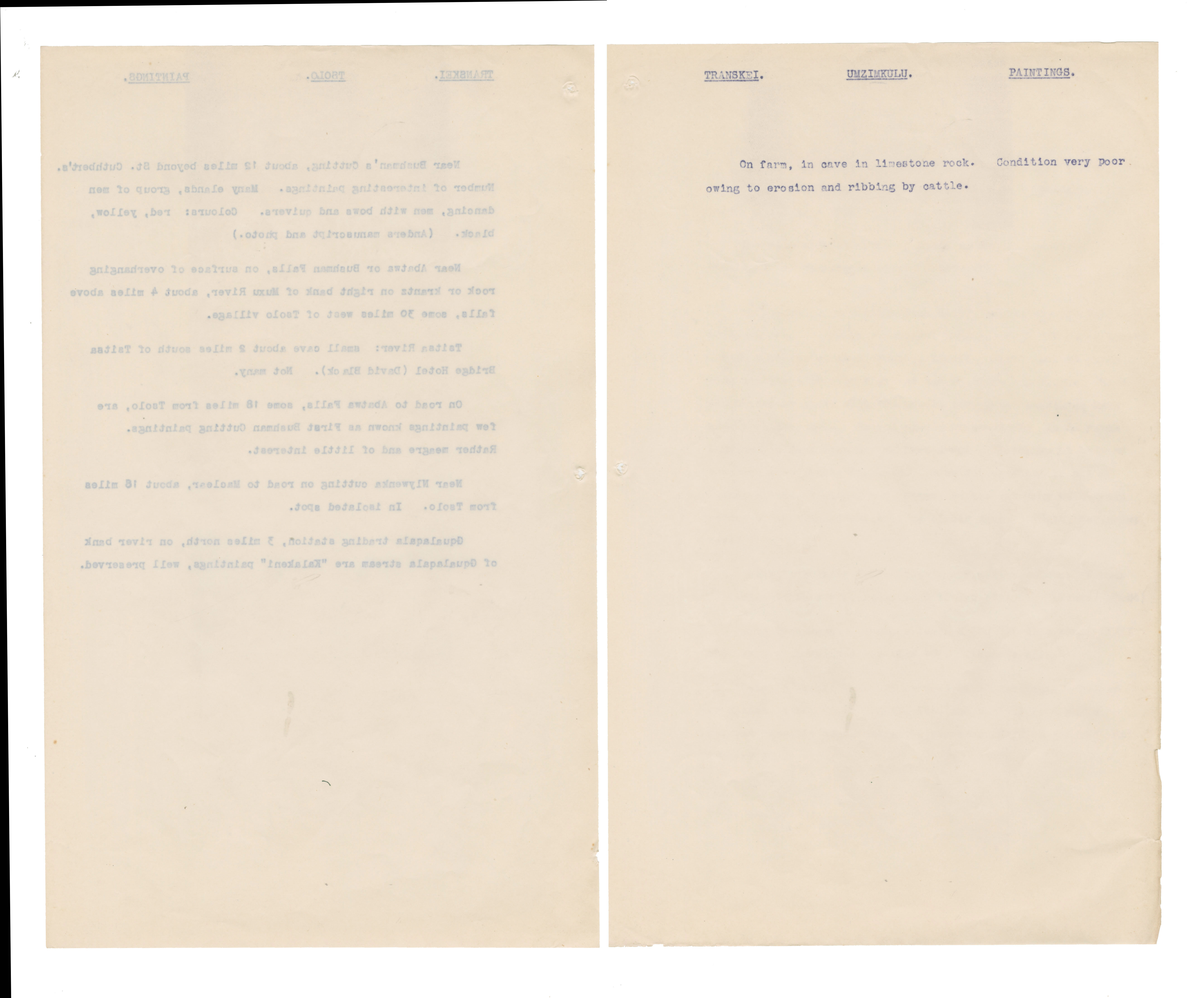 Typewritten notes (facsimiles?) on sheer paper about southern African rock engravings.