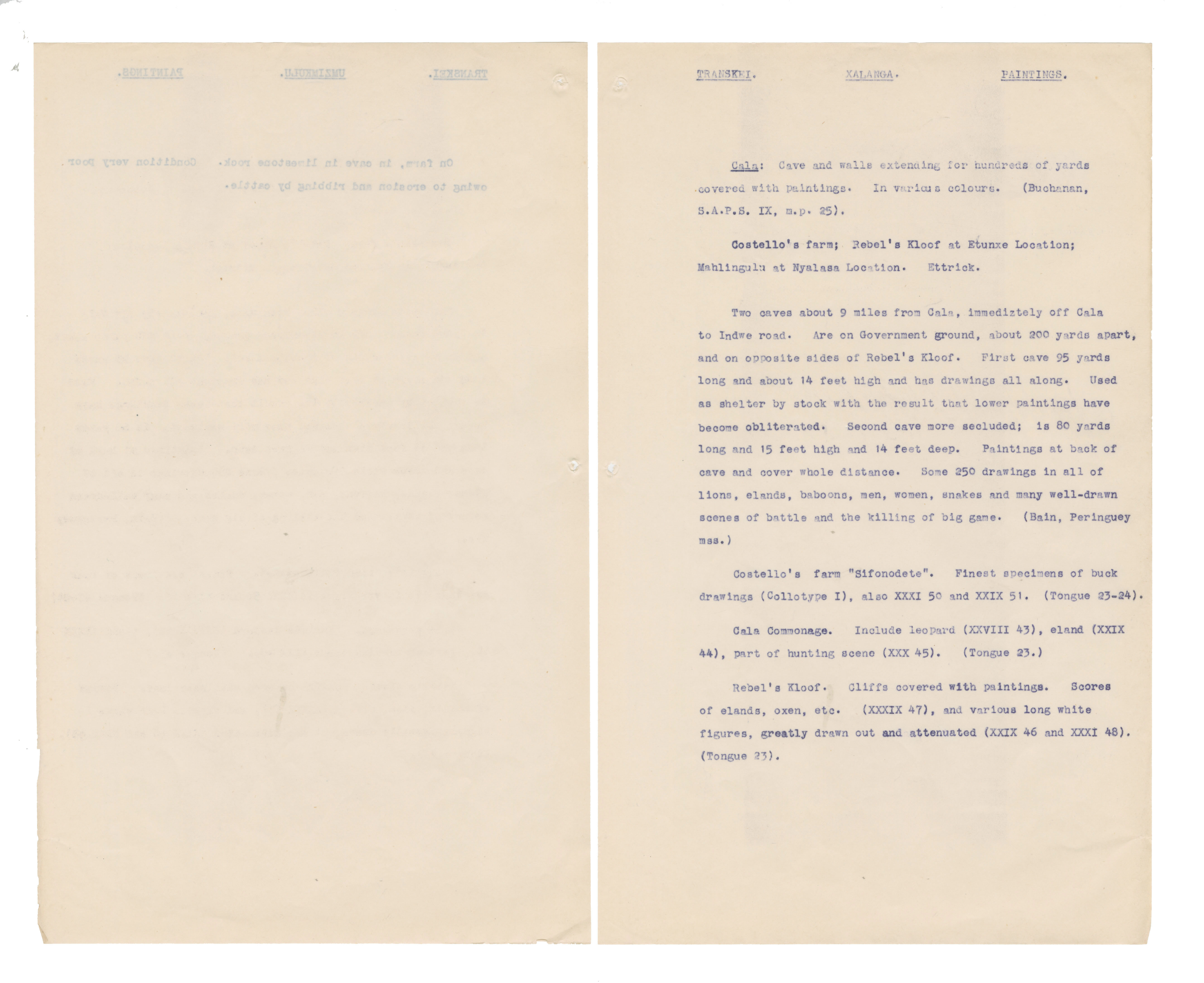Typewritten notes (facsimiles?) on sheer paper about southern African rock engravings.