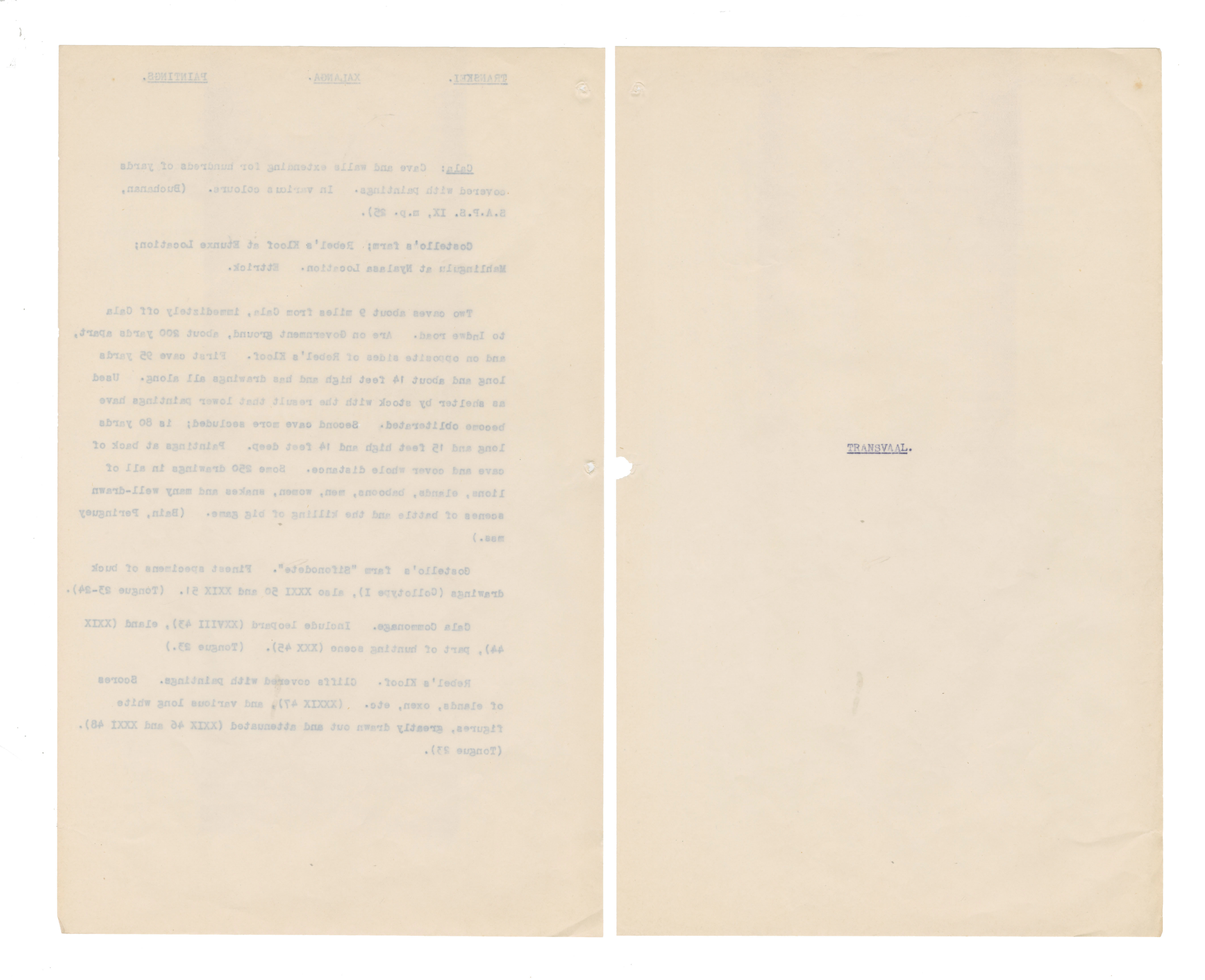 Typewritten notes (facsimiles?) on sheer paper about southern African rock engravings.