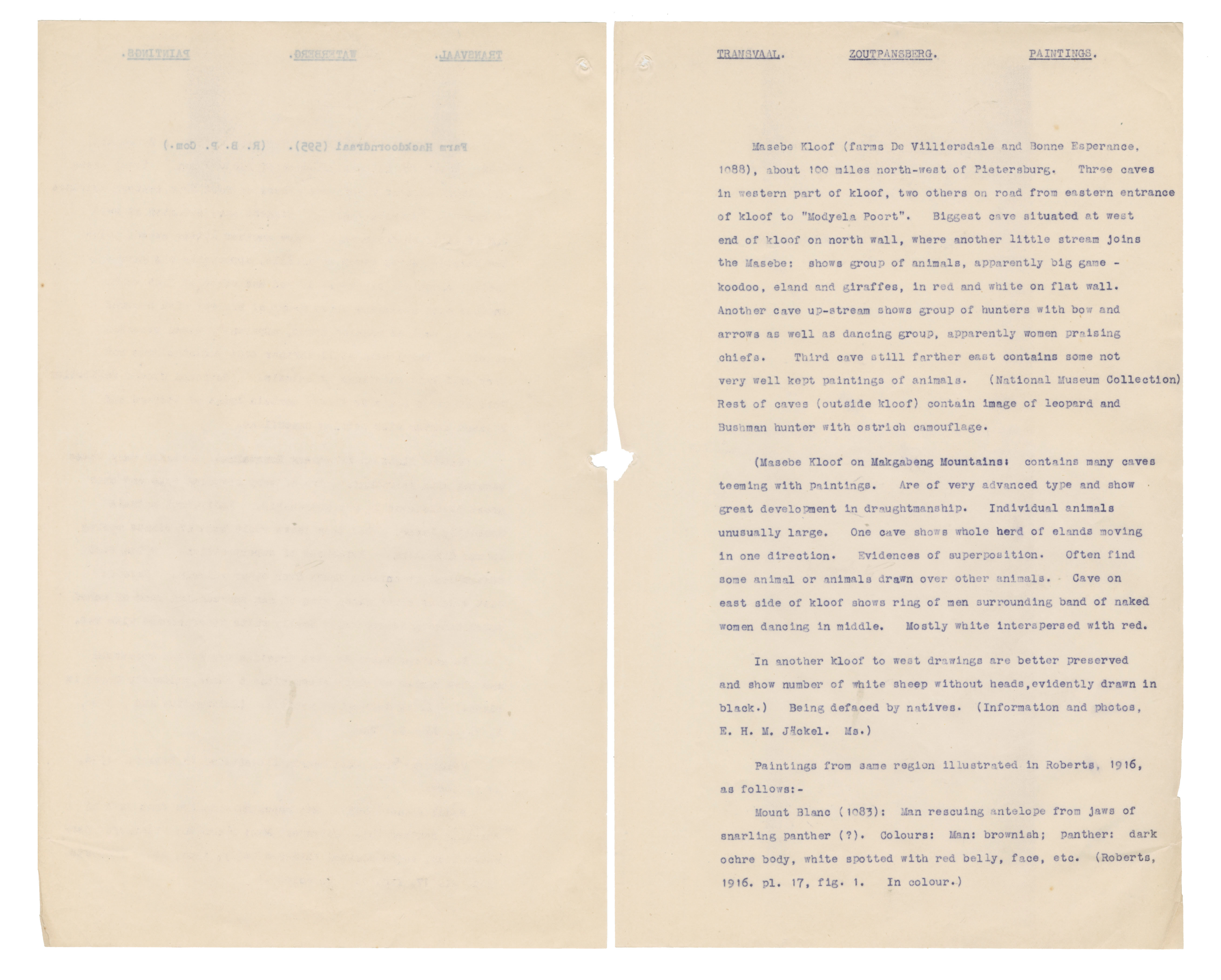 Typewritten notes (facsimiles?) on sheer paper about southern African rock engravings.